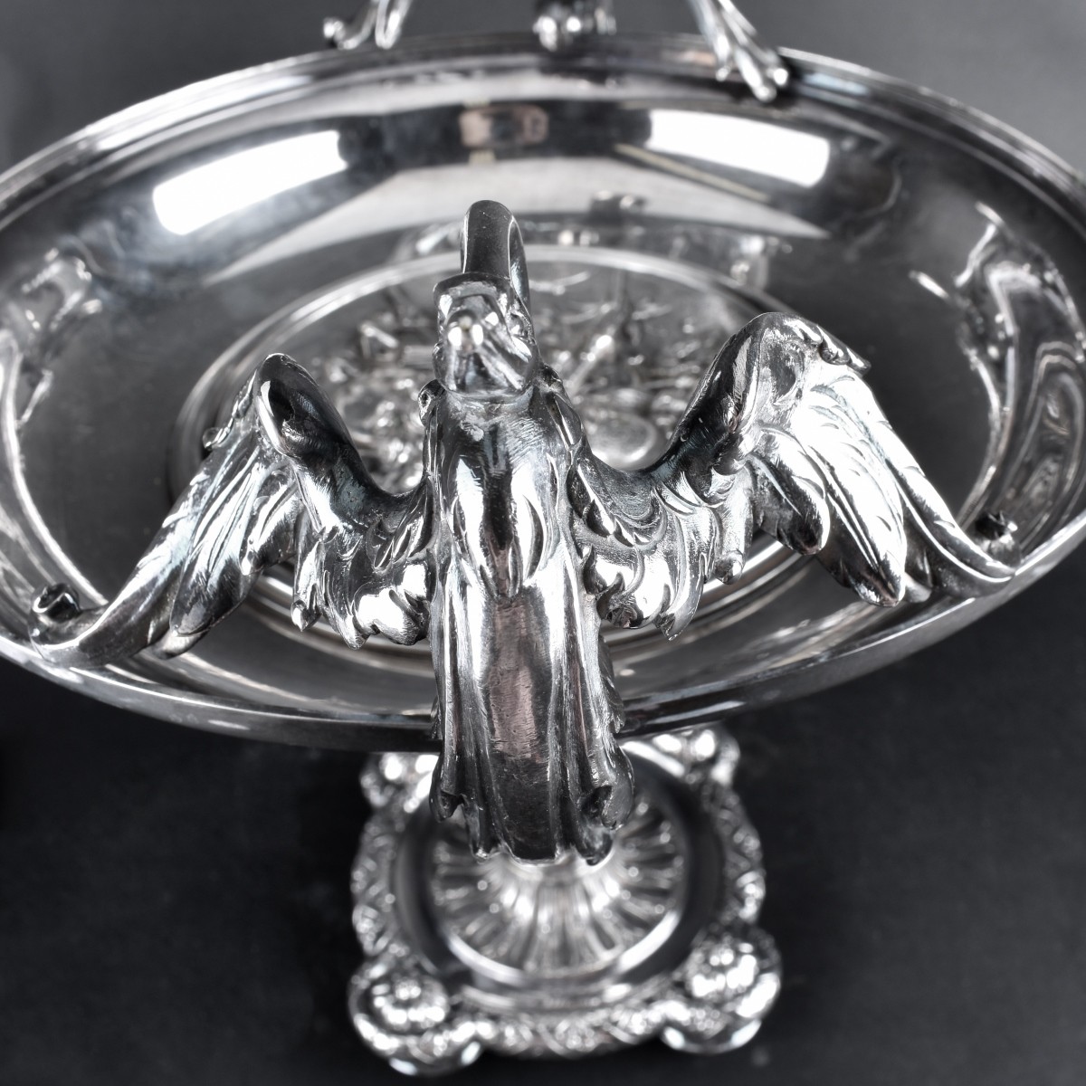 Early 20th Century Italian Silverplated Over Bronze Tazza with Bird Figural at the Rim. Unsigned. Figural scene on center. Measures 12-3/4" H x 12-1/2" W. Condition: Good condition Estimate: $200.00 - $400.00 Domestic Shipping: Third party