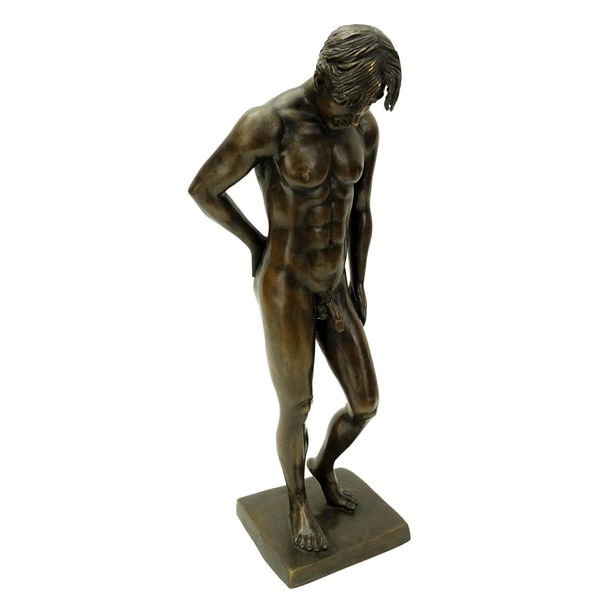 Large German School Bronze Male Nude Sculpture. Unsigned. Measures 17-3/4" H. Condition: Good condition Estimate: $200.00 - $400.00 Domestic Shipping: Third party