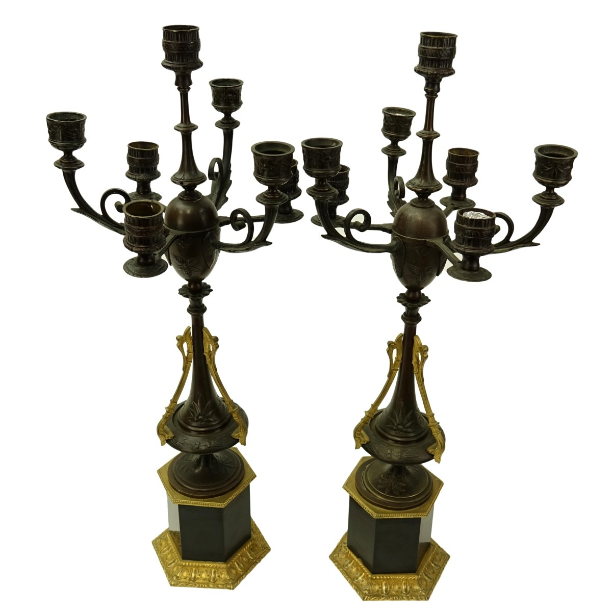Pair of Antique French Empire Style Bronze Parcel Gilt and Marble Candelabra. Total of seven arms. floral relief and embellish patterns on gilt surface. Measures 22-3/4" H Condition: One candelabra has a few chips to the marble surface Estimate: $600.00 - $800.00 Domestic Shipping: Third party