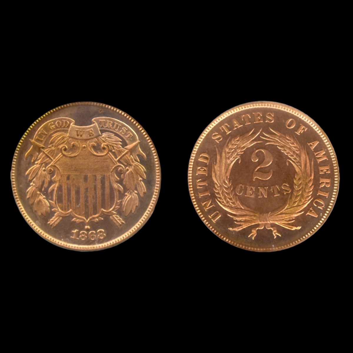 1868 US Shield Two Cent Encased Bronze Coin. Front: Shield. Obverse: wreath. Designed by James B. Longacre. Size: 23mm. Weight: 6.22 grams. Condition: PR65 RD Estimate: $6000.00 - $8000.00 Domestic Shipping: $30.00