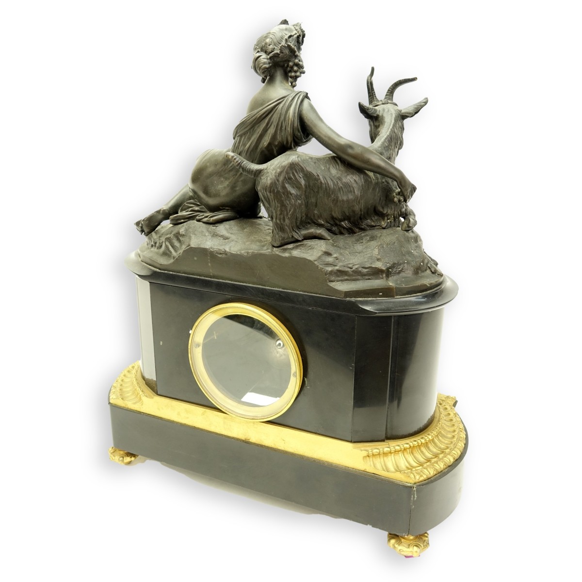 19th Century French Black Slate and Gilt Bronze Mantle Clock . Figural woman top with goat and grapes. Unsigned. Enamel dial with Roman numerals, foliage crest, Clock measures 20" H x 16" W. The gallery does not warranty the running condition of clocks. Condition: Some wear to the slate, missing crystal, no key or pendulum Estimate: $800.00 - $1200.00 Domestic Shipping: Third party