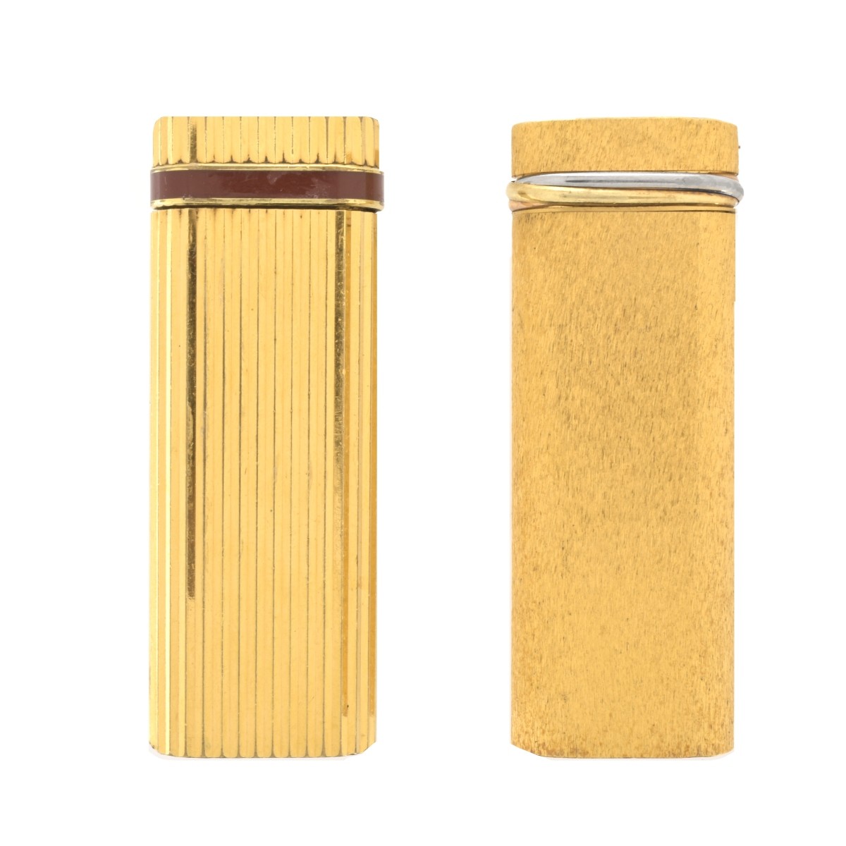 Two Vintage Cartier Gold Lighters. Godrun Stripe down the sides and red accent on top serial number 47694P, measures 2-3/4 " the other with a matt finish gold silver accent on top serial number 09024P measures 3" . Both signed Cartier, Swiss made, Plaqu or g Has literature on how to fill the lighter, in a red box not marked Cartier Condition: Good condition, some scuffing as would be with a pre owned item. both movements move. Estimate: $200.00 - $400.00 Domestic Shipping: $32.00