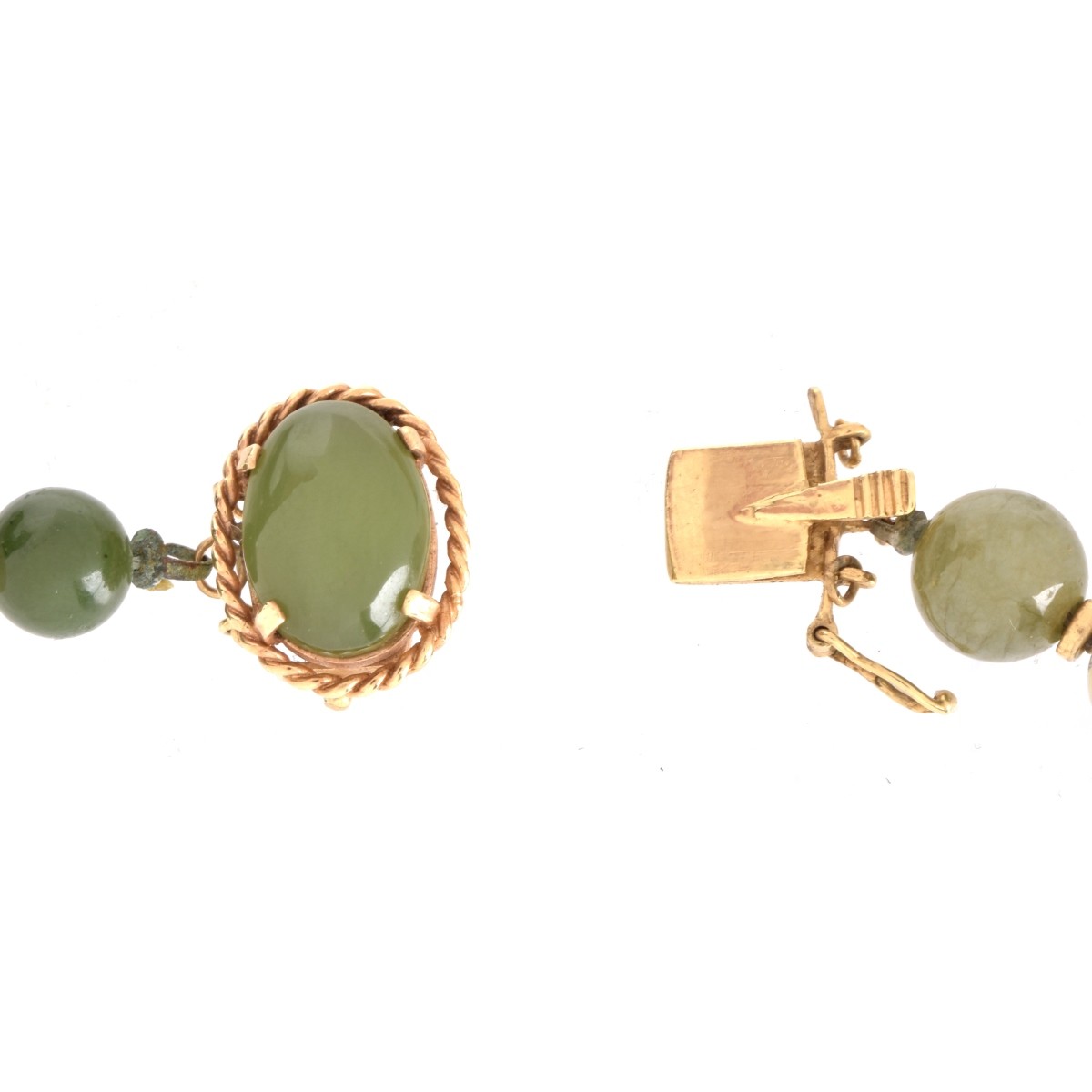 Vintage Single Strand 8-9.5mm Multi Color Jade Bead and 14 Karat Yellow Gold Necklace. Measures 46" L. Approx. weight: 141.8 grams. Condition: Very good vintage condition. Estimate: $200.00 - $250.00 Domestic Shipping: $32.00
