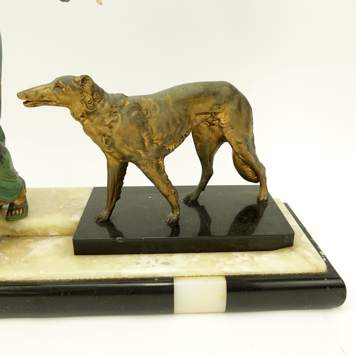Possibly Amelia Cate De LaTour (French 20th Century) Art Deco Statue, composition and spelter woman standing with spelter borzoi dogs. unsigned. Measures Lady 17" H from Dog to Dog 27" W. Marble base (to bottom of dogs foot) 3" H x 13" W x 7" D Condition: Good to fair condition. Marbles broken and repaired. dogs loss of gold paint on metal. Paint loss to wood head and hands, paint loss to spelter clothes. Estimate: $200.00 - $400.00 Domestic Shipping: Third Party