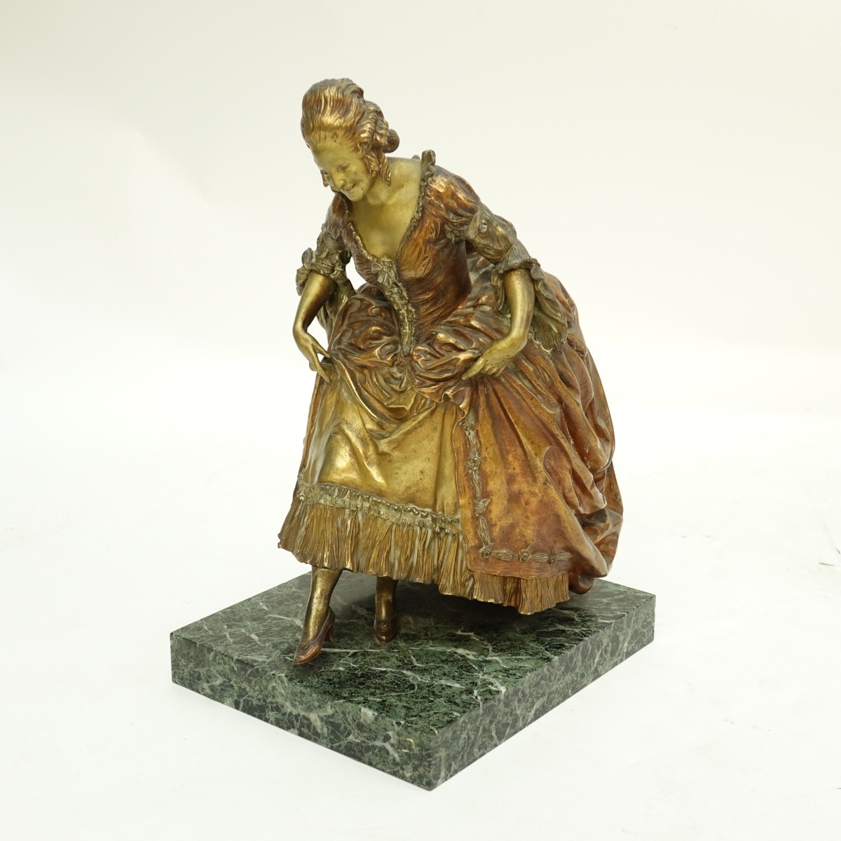 Juan Clara Bronze Lady in period clothes dancing on a green piece of marble.. signed to back of dress. She measures 16" H x 9" w x 11-3/4 marble is 1-3/4" H x 11-5/8 x 9-3/4" Condition: Good condition. Marble base chip to back corner. Estimate: $800.00 - $1000.00 Domestic Shipping: Third Party