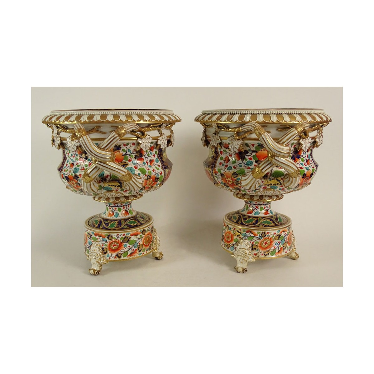Impressive Pair of Porcelain 'Japan' Pattern Warwick Wine Coolers Attributed to Bloor Derby, England c. 1825. Ornate Motif with Grape Vine and Leaves Around the Rim. Very Colorful. Signed with Iron Red "24" On One. . Each Measures 14-1/4 Inches Tall, 10 Inch Diameter at Top Opening, 15-1/2 Inches From Handle to Handle. Condition: Both with Hairline Cracks, one on Interior of Bowl as well as an old Repair to a Foot. The Other with a Hairline to bottom. Losses to Leaves, Crazing and Wear Consistent With Age Estimate: $3000.00 - $5000.00 Domestic Shipping: Third Party