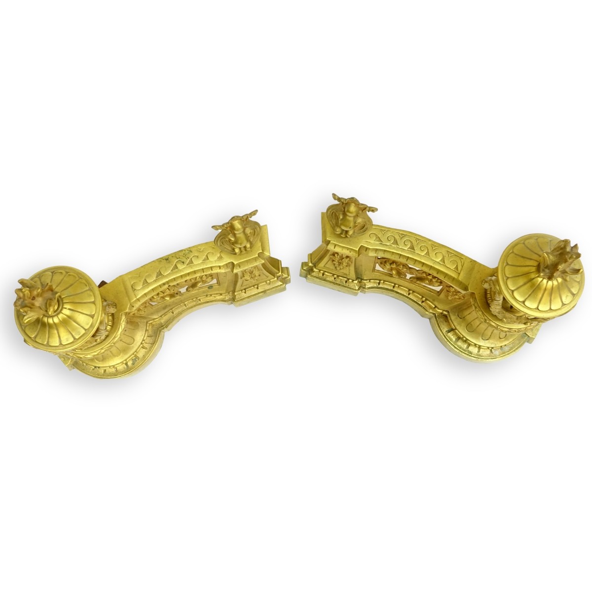 Pair Louis XVI Style French Gilt Bronze Ornate Fireplace Chenets. Each measures 13-1/2" H x 14-1/4" W x 3-1/4" D Condition: Good condition. Bolts are rusted and a back arm. Estimate: $200.00 - $400.00 Domestic Shipping: $98.00