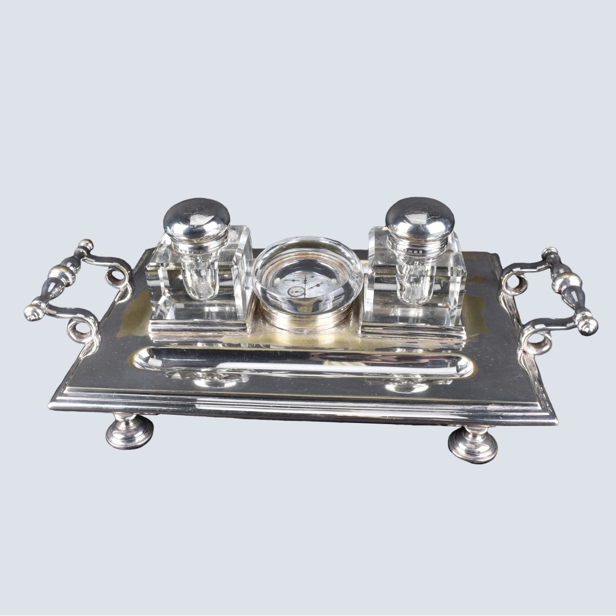 Antique English Silver Plate Inkstand with Crystal Inkwells with Sterling Silver Tops. Hallmarks on the lids, stand is unmarked. Meridian Calendar on the center. Bottles measures 3-1/2" H x 2-1/4" W, stand measures 3" H x 15-1/2" L Condition: Some rubbing to plating otherwise good condition Estimate: $400.00 - $600.00 Domestic Shipping: $78.00