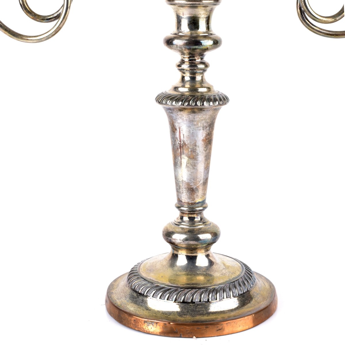 Pair of Large 19th Century English Sheffield Silver Plate Two-Part Arm Candelabra and Glass Inserts. Possibly with associated top. Unmarked. Measures 18" H x 17-1/4" W, overall measures 27-1/2" H. Condition: Needs cleaning Estimate: $200.00 - $400.00 Domestic Shipping: Third party