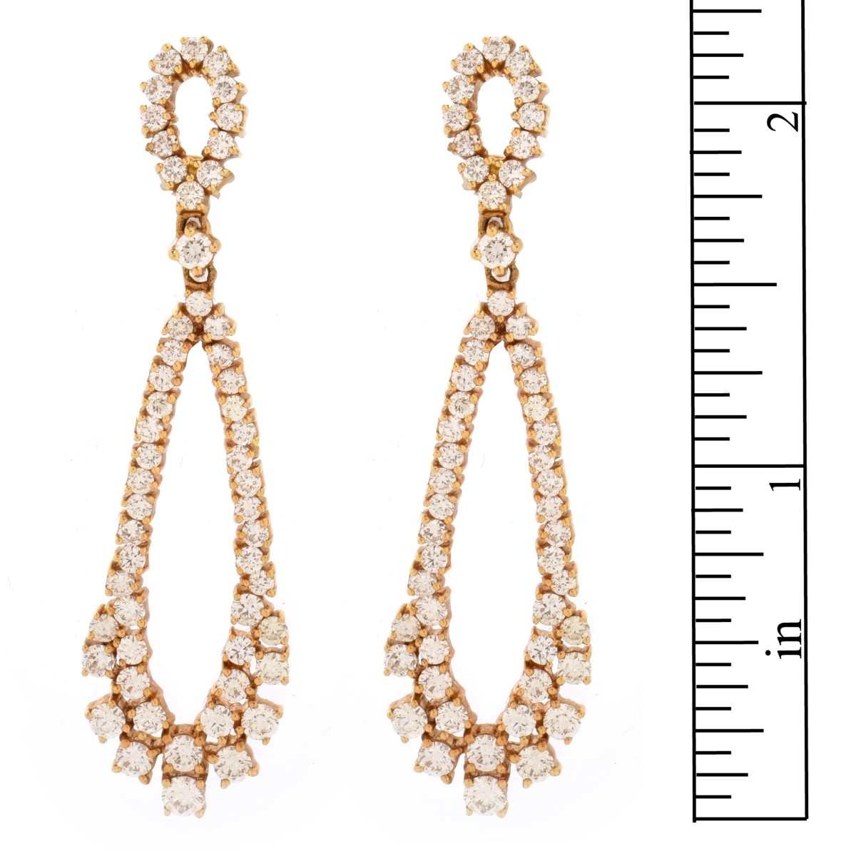 Approx. 4.03 Carat TW Round Brilliant Cut Diamond and 18 Karat Yellow Gold Pendant Earrings. Diamonds F-G color, VS clarity. Stamped 750. Measure 2-1/4" L, 9/16" W. Approx. weight: 13.1 grams. Condition: Very good condition. Estimate: $3500.00 - $4500.00 Domestic Shipping: $30.00