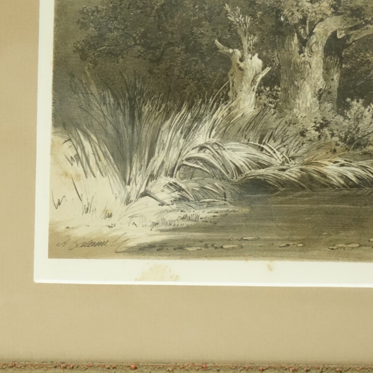 Two (2) Alexandre Calame (1810-1864) Swiss Landscape Oak Trees Lithographs. Chenes and Chenes et Alnes. Signed lower right in plate, publisher Imp. Lith. de Cattier a Paris. Figures para Ferogio. Measures sight 12" H x 15-1/4" W Frame 18-3/4" H x 22-3/4" W Condition: Good condition, foxing to lithographs. Estimate: $200.00 - $400.00 Domestic Shipping: $115.00