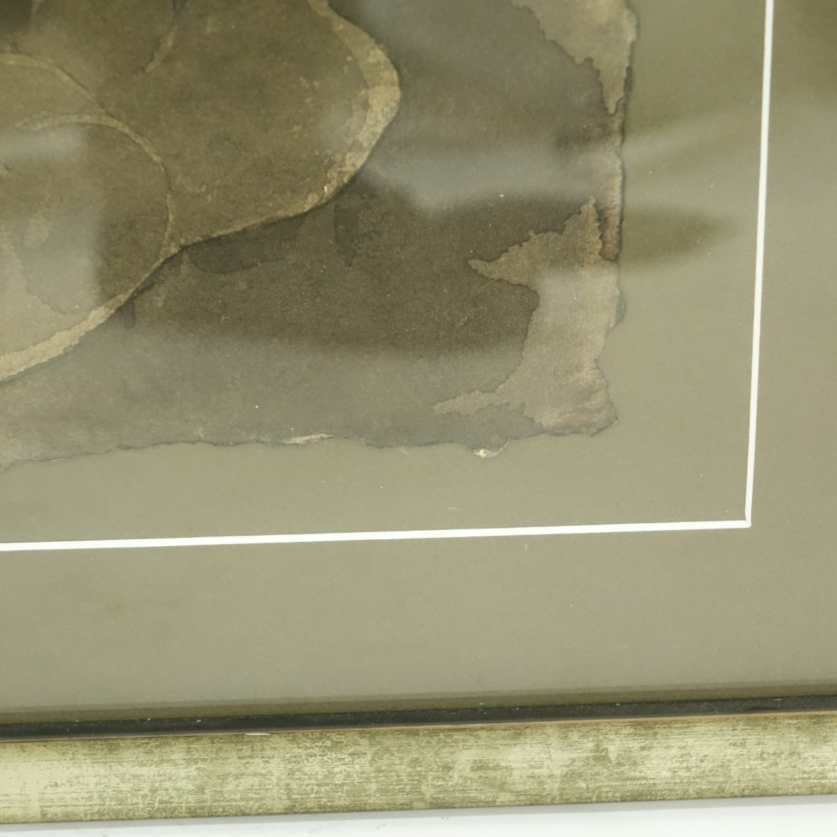 Two (2) Dark Abstract Ink Gouache signed illegibly. Gouache on watercolor paper, laid on background. One signed illegibly. Both Measures site12-1/2" x 9-1/2" Frame 20-3/4" x 17-3/4" Condition: Good condition. Estimate: $100.00 - $200.00 Domestic Shipping: $89.00