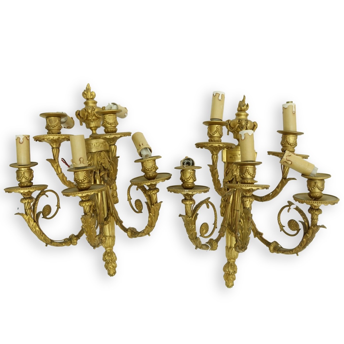 Pair of 19th Century French Louis XVI Style Ormolu Bronze Five Arm Sconces. Fluted stem, urn finial, foliage and acanthus leaves motif. Measures 19" H x 13-1/2" W. Condition: Rubbing otherwise good condition Estimate: $1000.00 - $2000.00 Domestic Shipping: Third party