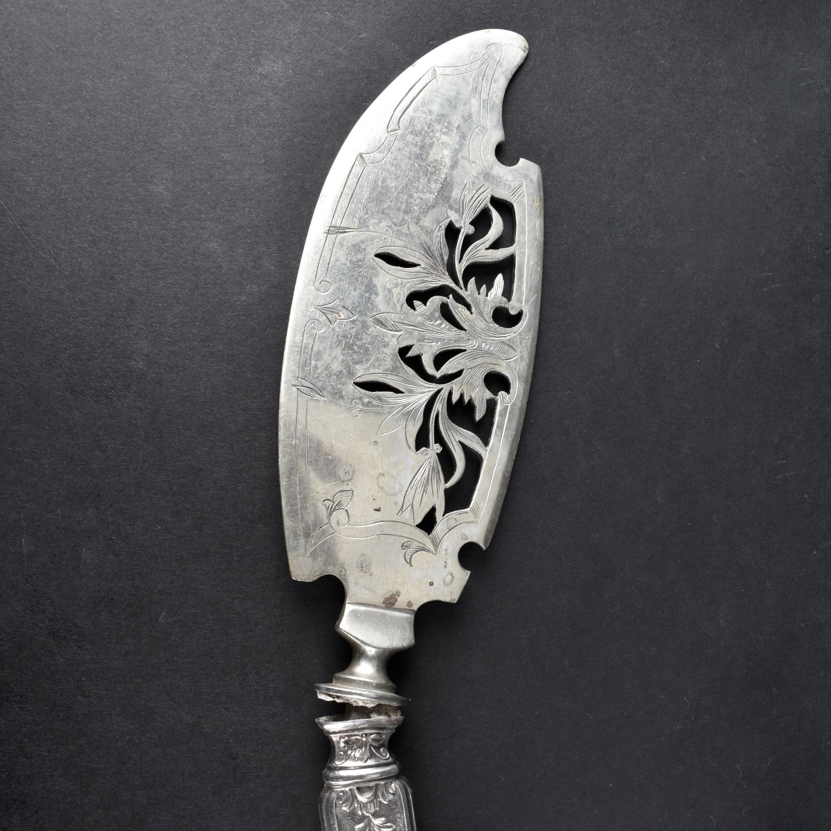 Item Condition: Good condition. Hollow silver handles good some scratching. Asparagus holder head is broken off. Fish server bent at neck. Some rust to bak of meat fork.