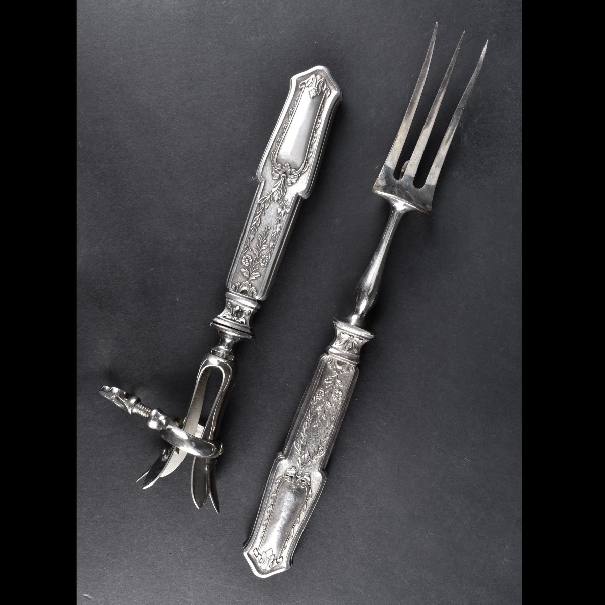 Four (4) French 800 Silver Ornate Hollow Handle Serving Pieces. Provinance from Cafe Riche, Cairo. 1 Meat carving fork silver hollow handle plate tines, 1 Pierced fish server silver hollow handle plate server, 1 Asparagus server silver hollow handle plate server, Bone Holder silver hollow handle plate holder. Hallmarked with Minerva head no numbers. Larges piece measures 10-1/2" Long. Condition: Good condition. Hollow silver handles good some scratching. Asparagus holder head is broken off. Fish server bent at neck. Some rust to bak of meat fork. Estimate: $100.00 - $200.00 Domestic Shipping: $58.00