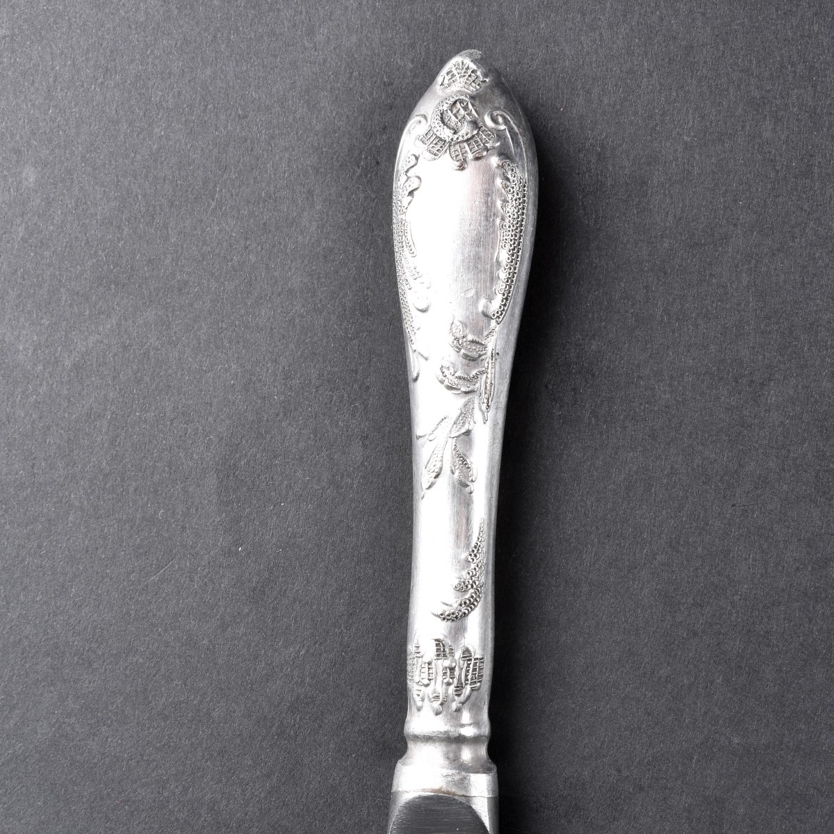 Eighty Five (85) Pieces Russian Silverplate Flatware. Set for 12, pattern C with a crown. 12 Large knives 9", 12 Small knives, 12 Large forks 8-1/8", 12 Salad forks, 12 Large spoons 8-1/2", 12 Soup spoons, 12 Teaspoons, 1 large ladle. Marked to back in Russian Ussr, 3mn Melchior, and the price. Box for display purposes only. Condition: Good condition, two spoons slightly bent a few need polish. Estimate: $100.00 - $200.00 Domestic Shipping: $68.00