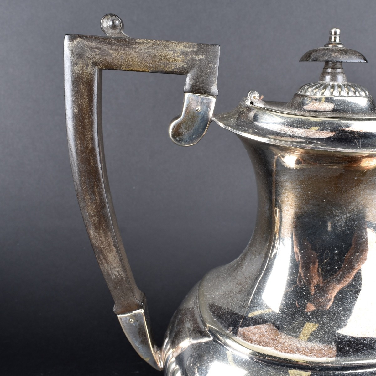 Vintage Sheffield English Silver Plate Five (5) Piece Tea Service. Includes: Teapot, coffee pot, creamer and sugar, and waste bowl. Signed to base. Teapot measures 9" H x 11" W. Condition: Needs cleaning Estimate: $100.00 - $150.00 Domestic Shipping: $72.00
