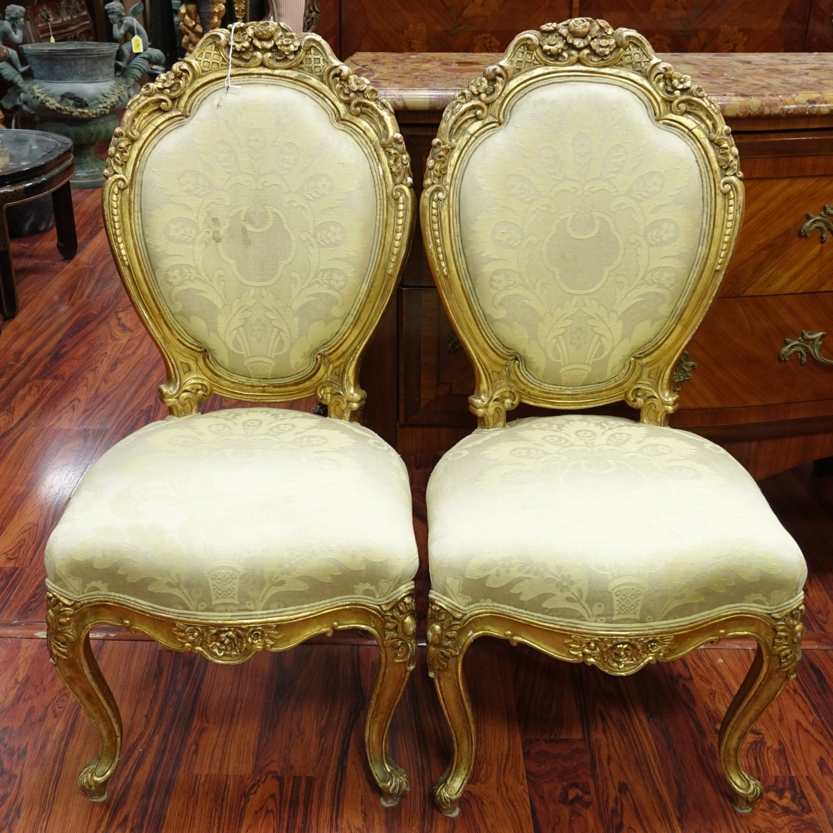 Pair of 19/20th Century Giltwood Carved Rococo Style Upholstered Side Chairs. Carved garlands and acanthus leaves motif, stands on cabriole legs. Measures 38" H x 18" W. Condition: Rubbing to gilt and typical splits to wood otherwise good condition Estimate: $100.00 - $200.00 Domestic Shipping: Third party
