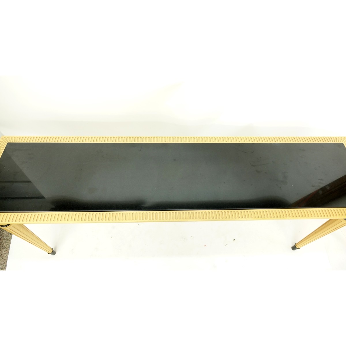 David Linley, British (B. 1961) Mid Century Modern Satinwood and Ebonized Marble Top Console Table. Fluted top and stands on fluted tapering legs. Measures 32" H x 78" W x 20" D. Condition: Good condition Estimate: $2000.00 - $3000.00 Domestic Shipping: Third party