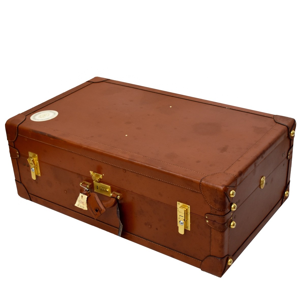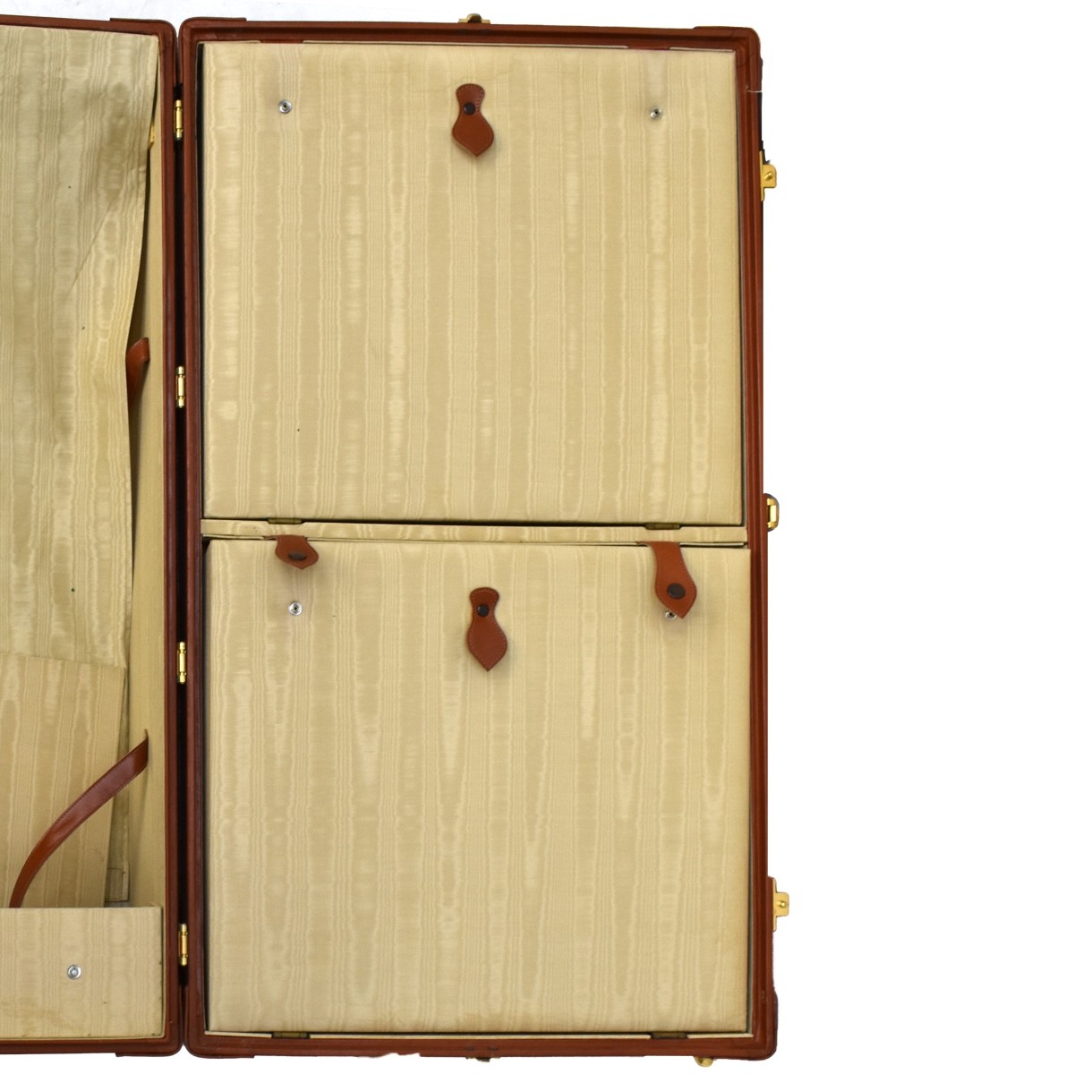 Large Vintage Dunhill Hardshell Leather Trunk. Gilt metal hardware with side and top handle, interior storage compartment, and combination lock. Measures 13" x 36" x 21". Condition: Scratches and typical wear from use Estimate: $300.00 - $500.00 Domestic Shipping: $68.00