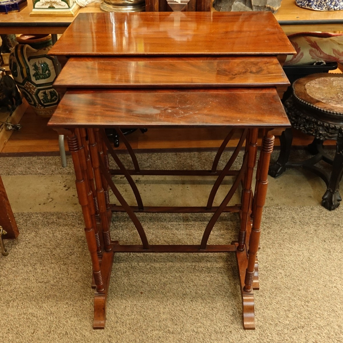 Set of Three Early 20th Century Queen Anne Style Carved Wood Nesting Tables. Tallest measures 31" H x 29" W x 18" D, shortest measures 30" H x 21-1/2" W x 15" D. Condition: lower tables have scuffs to top, light scratches Estimate: $200.00 - $300.00 Domestic Shipping: Third party