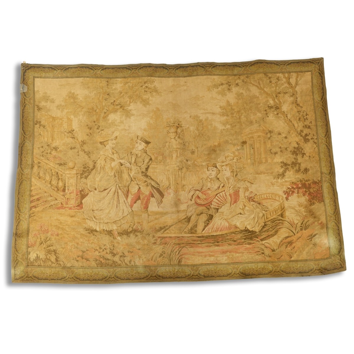 Early 20th Century French People Tapestry. unsigned machine made. Measures 43" H x 64" W Condition: Good condition, some light fraying to top. left side has rip Estimate: $50.00 - $150.00