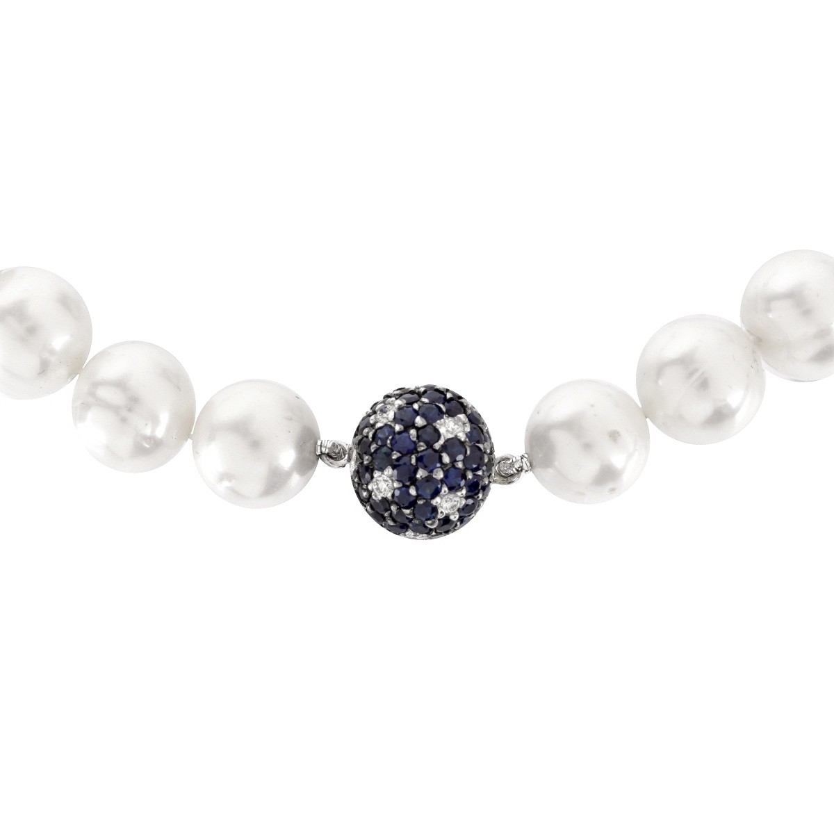 Approx. 22.10 Carat TW Round Cut Sapphire, 1.64 Carat TW Round Brilliant Cut Diamond, 10.5-11.50mm Baroque Pearl and 18 Karat White Gold Necklace. Sapphires with vivid color. Diamonds E-F color, VS clarity. Pearls with good polish and luster, natural blemishes. Clasp stamped 750. Measures 21" L. Approx. weight: 92.2 grams. Condition: Very good condition. Estimate: $2800.00 - $3800.00 Domestic Shipping: $30.00