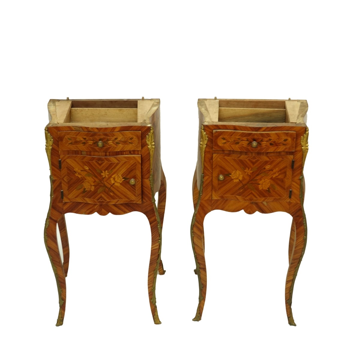 Pair of Antique French Louis XV style Marquetry Inlaid Kingwood Marble Top Side Tables/Night Stands. Single sliding drawer and door, gilt bronze fittings, stands on high cabriole legs. Measures 32-1/2" H x 17-1/2" W x 13-1/2" D. Condition: Normal wear and losses to the veneer otherwise good condition Estimate: $400.00 - $600.00 Domestic Shipping: Third party