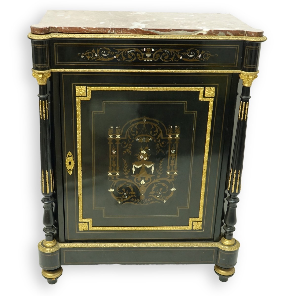 19th Century French Napoleon III Boulle Inlaid Ebonized Marble Top Side Cabinet. Large single door, gilt bronze mounts, fluted columns, and shelves on interior. Measures 43-1/2" H x 33" W x 16" D. Condition: Marble has a chip to corner, Estimate: $700.00 - $900.00 Domestic Shipping: Third party