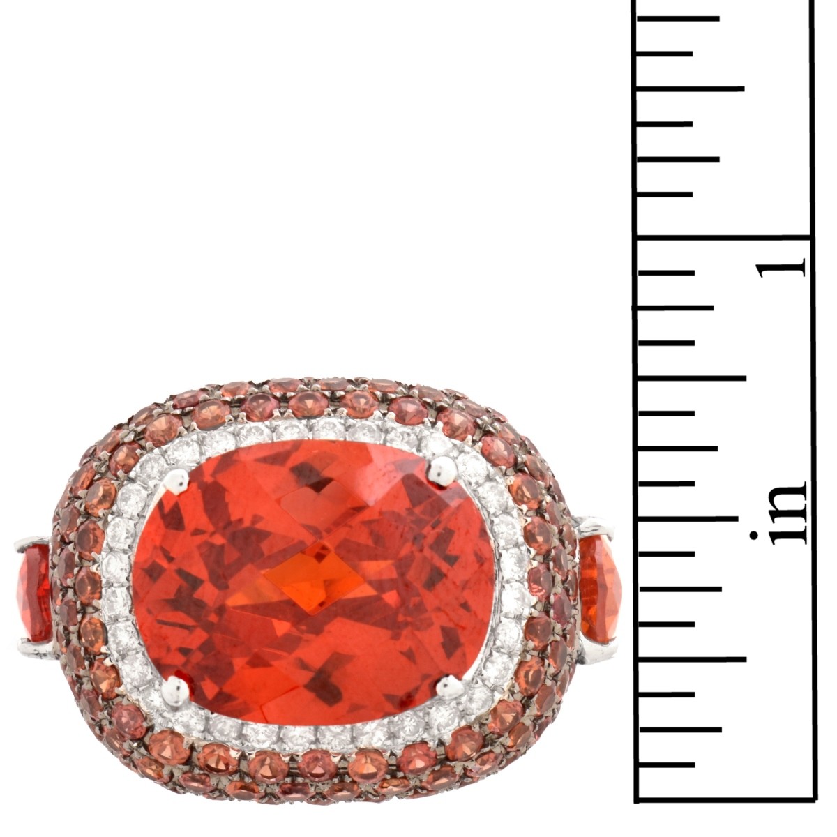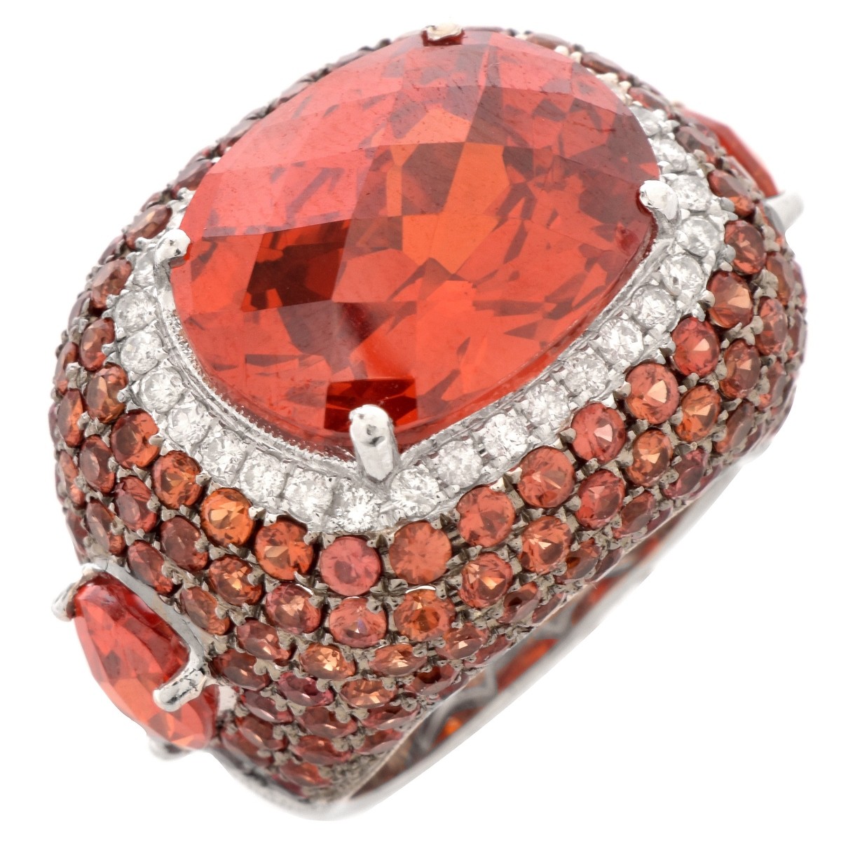 Approx. 25.75 Carat TW Oval and Pear Shape Rose Cut Citrine, 5.84 Carat TW Pave Set Round Cut Orange Sapphire, .43 Carat TW Round Brilliant Cut Diamond and 14 Karat White Gold Ring. Citrines and sapphires with vivid color. Stamped 585. Ring size 6. Approx. weight: 18.9 grams. Condition: Very good condition. Estimate: $1500.00 - $2500.00 Domestic Shipping: $28.00