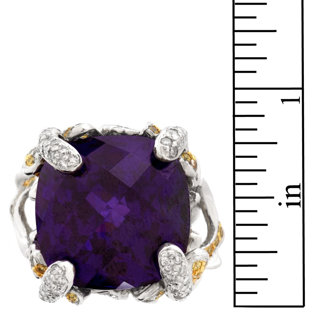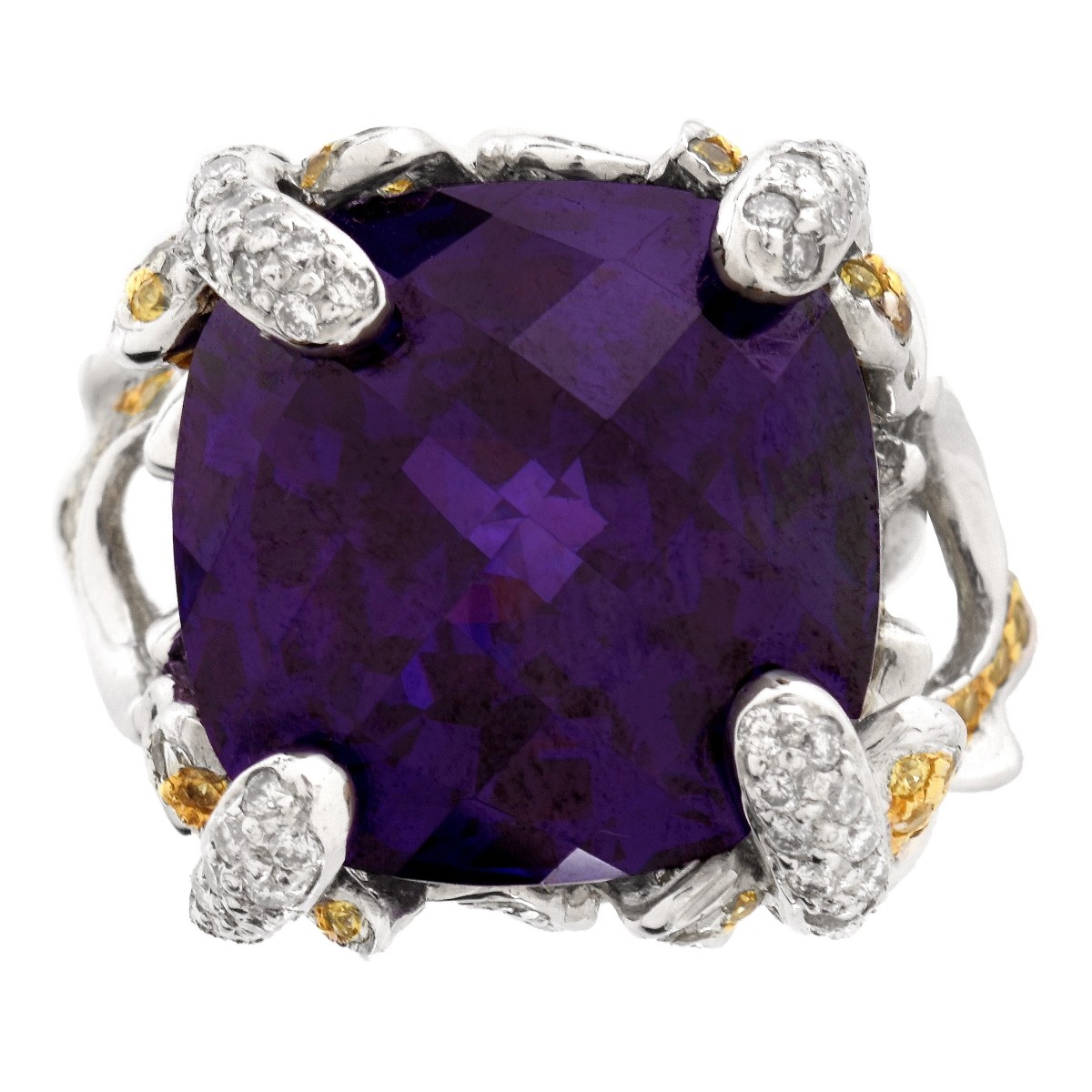 Approx. 41.28 Carat Square Rose Cut Amethyst, .74 Carat TW Round Brilliant Cut Diamond, 1.08 Carat TW Round Cut Yellow Sapphire and 14 Karat White Gold Ring. Amethyst and sapphires with vivid color. Diamonds E-F color, VS clarity. Stamped 585. Ring size 7. Approx. weight: 24.0 grams. Condition: Very good condition. Estimate: $1200.00 - $1800.00 Domestic Shipping: $20.00