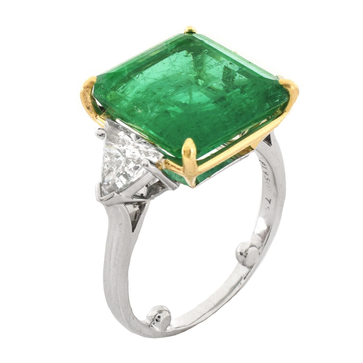 AGL Certified 7.91 Carat Colombian Emerald, 1.10 Carat TW Triangular Shape Diamond, Platinum and 18 Karat Yellow Gold Ring. Emerald with vivid color. Diamonds E-F color, VVS-VS clarity. Stamped Plat, 750. Ring size (with sizing balls): 5. Approx. weight: 7.4 grams. AGL report to accompany this Lot. Condition: Very good condition. Estimate: $18000.00 - $24000.00 Domestic Shipping: $30.00