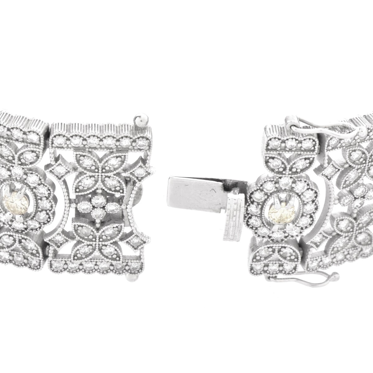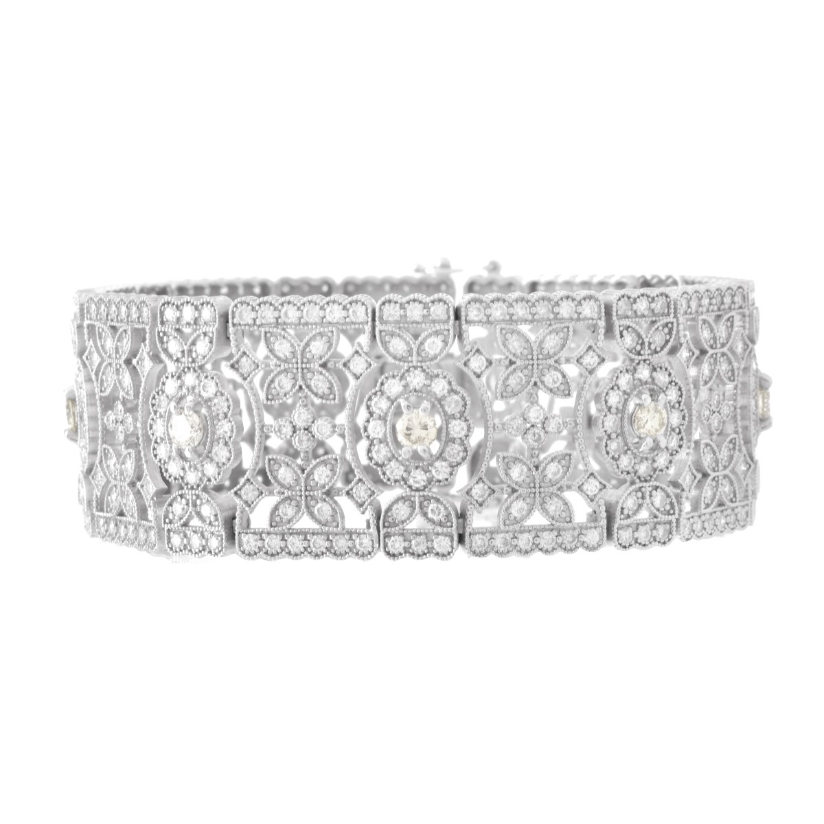 7.16 Carat TW Edwardian Design Round Brilliant Cut Diamond and 18 Karat White Gold Bracelet. Diamonds majority E-F and some I-J color, VS1-VS2 clarity. Measures 7-1/8" L, 7/8" W. Approx. weight: 57.3 grams. Condition: Very good condition. Estimate: $5000.00 - $7000.00 Domestic Shipping: $30.00