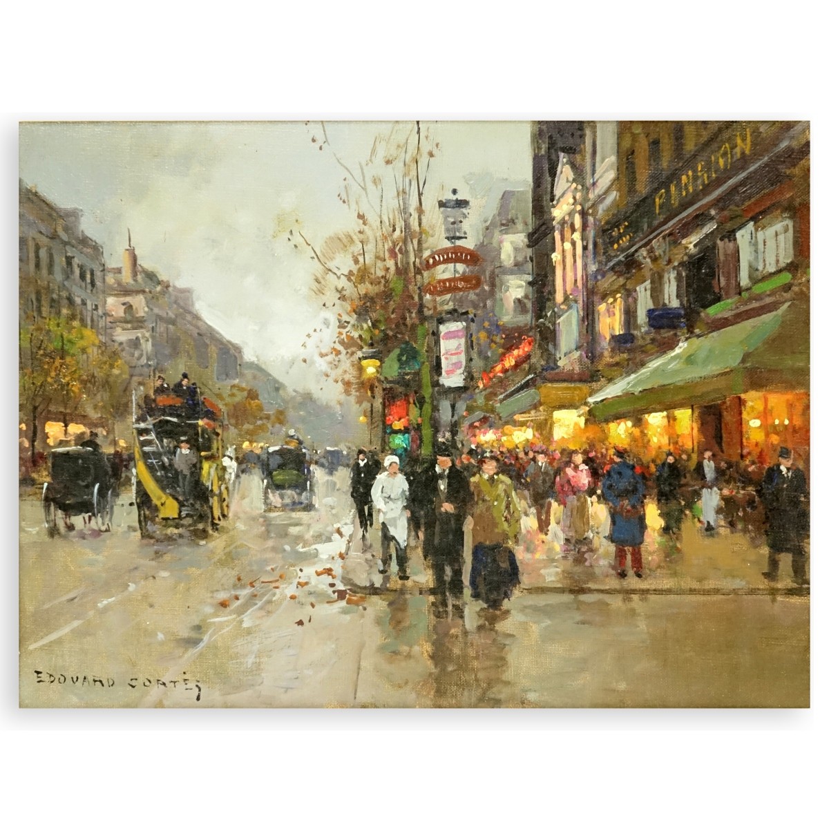 Edouard Léon Cortès, French (1882–1969) Oil on Canvas, Paris Evening Street Scene. Signed lower left. Measures 13-1/4" H, 18" W; frame measures 20-1/4" H, 25-1/4" W. Provenance: Wally Findlay Galleries, Chicago. Condition: Very good condition. Estimate: $15000.00 - $20000.00 Domestic Shipping: $185.00
