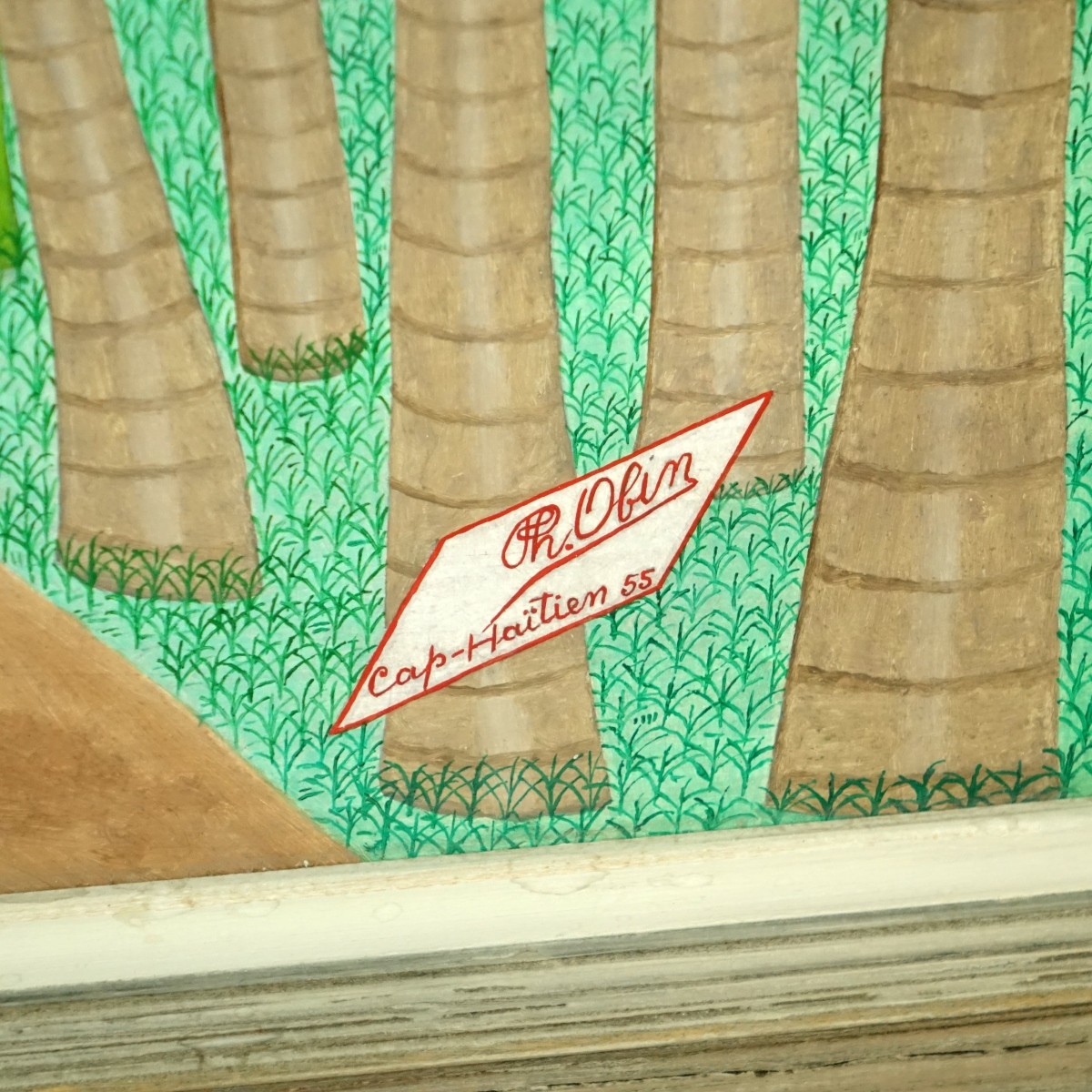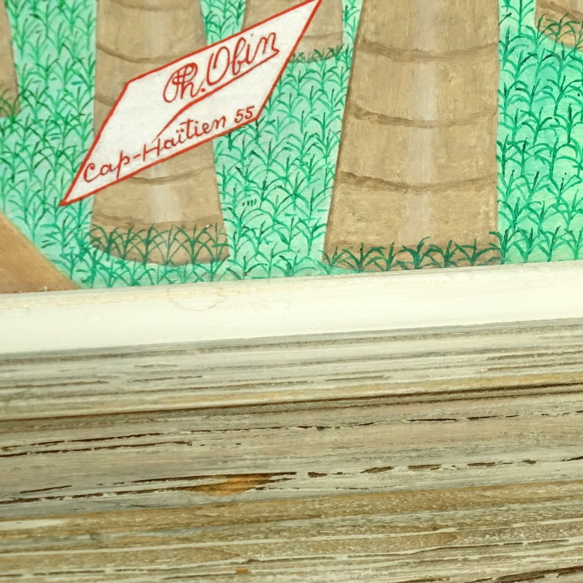 Philomé Obin, Haitian (1892–1986) Circa 1955 Oil on Artist Board, "Bois neuf". Signed lower right Ph. Obin Cap-Haitian 55; titled lower center. Measures 20" H, 24" W; frame measures 26-1/2"H, 30-1/2" W. Condition: Very good condition. Estimate: $6000.00 - $8000.00 Domestic Shipping: $225.00