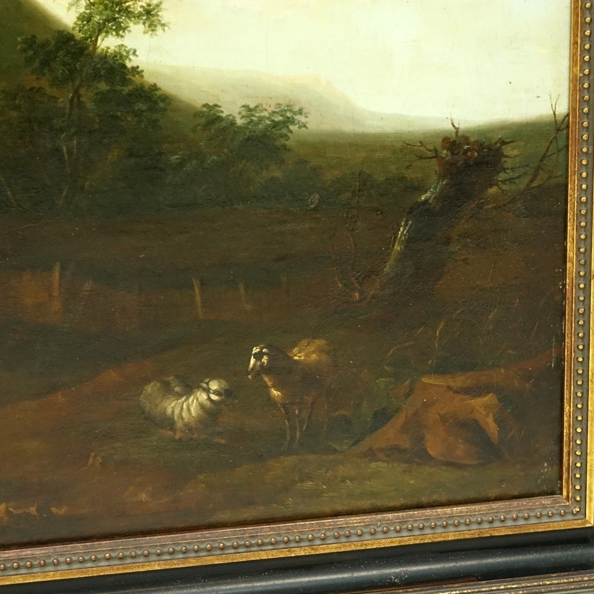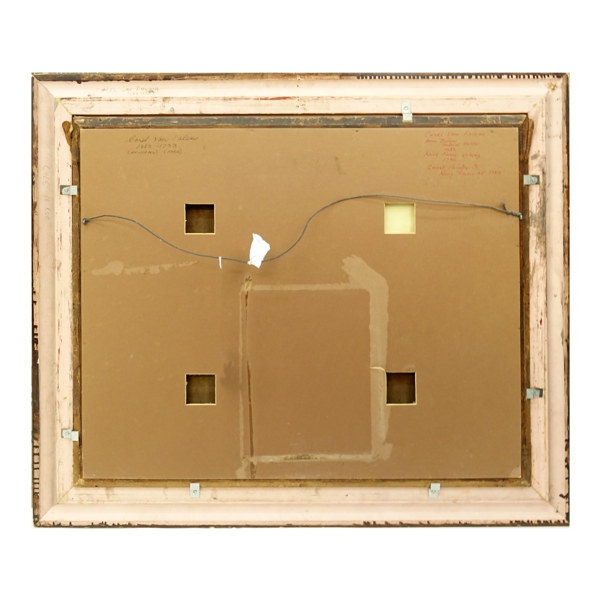 Attributed to: Carel Van Falens, Flemish (1683 - 1733) Oil on Canvas, Landscape Scene with Figures and Animals, Inscribed en verso in Multiple Areas. Measures 25" H x 31" W, frame measures 30-3/4" H x 37" W. A work listed as "attributed to:" the respective artist has not been authenticated by a recognized expert on the artist in question. We offer such a work without warranty as to authenticity. Condition: Craquelure, good conserved condition Estimate: $3000.00 - $5000.00 Domestic Shipping: Third party