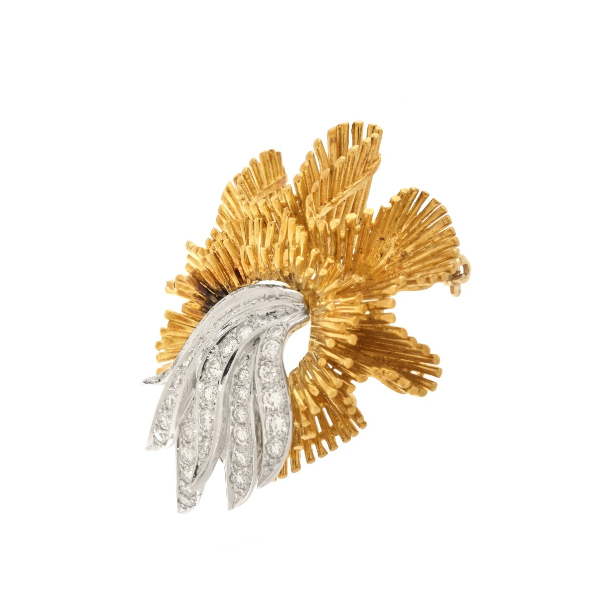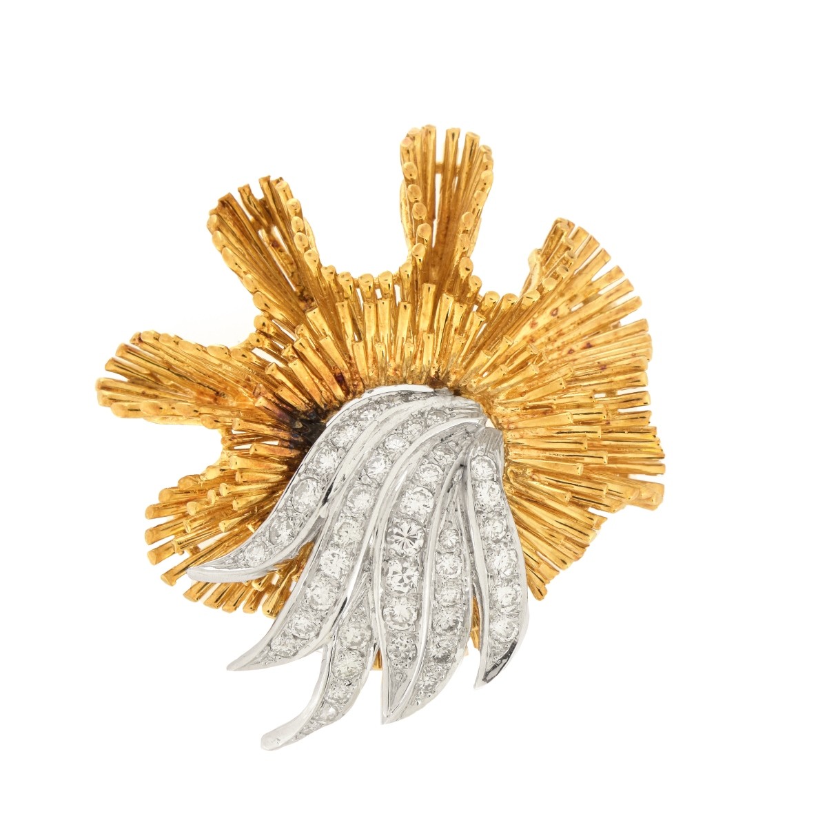 Vintage Mid 20th Century Approx. 2.0 Carat TW Round Brilliant Cut Diamond and 14 Karat Yellow and White Gold Spray Brooch. Diamonds F-G color, VS1-VS2 clarity. Measures 1-3/4" x 1-1/2". Approx. weight: 21.9 grams. Condition: Very good vintage condition. Needs cleaning. Estimate: $700.00 - $900.00 Domestic Shipping: $30.00