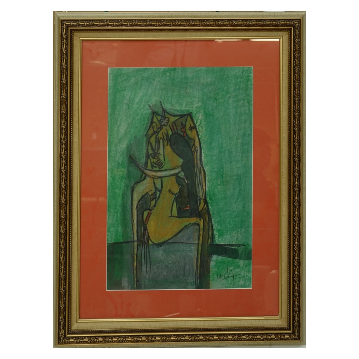 Attributed to Wifredo Oscar de la Concepcion Lam (1902-1982) Mixed Media Nude Woman. Signed lower right WiLm. Measures sight 18-3/4" H x 12-5/8" W Frame 28-1/4" H x 22-1/8" W Condition: Good condition, A work listed as "attributed to:" the respective artist has not been authenticated by a recognized expert on the artist in question. We offer such a work without warranty as to authenticity, the estimate reflects the lack of authentication and warranty. Estimate: $400.00 - $600.00 Domestic Shipping: $165.00