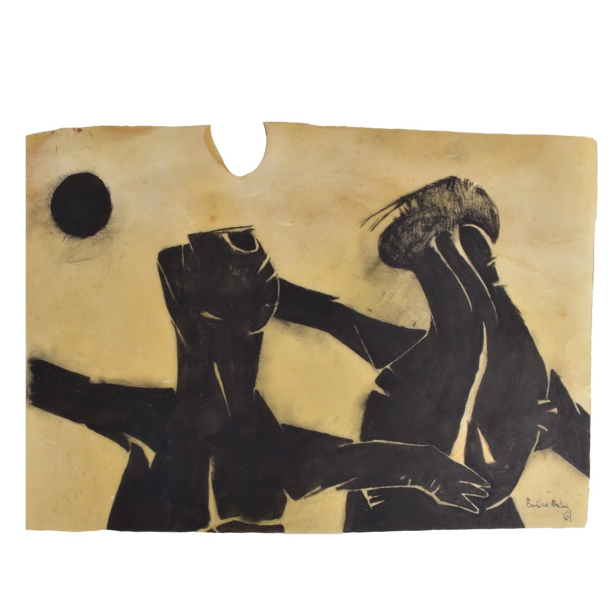 Two (2) Emilio Ortiz Mexican (1936- ) Abstract study Ink and Gouache on parchment/jute paper. Both signed lower right and dated 1961. Small measures 9-1/2" H x 7-3/4" W Large 9-1/4 x 13-1/8 Condition: Good condition, looks like left over paper he sketched on. Estimate: $100.00 - $200.00 Domestic Shipping: $46.00