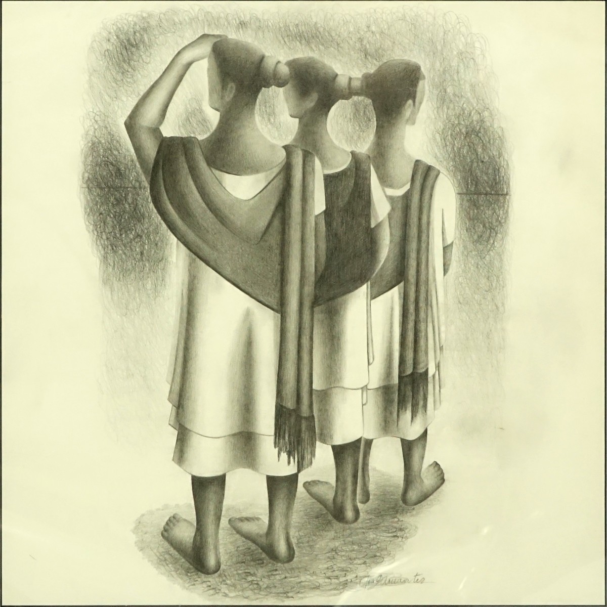 Attributed to: Francisco Dosamantes, Mexican/American (1911 - 1986) Charcoal on Paper, Three Villagers, Signed Lower. Measures 23-1/4" H x 23-1/4" W, 33-5/8" H x 33-1/2' W Condition: Good condition Estimate: $350.00 - $550.00 Domestic Shipping: Third party
