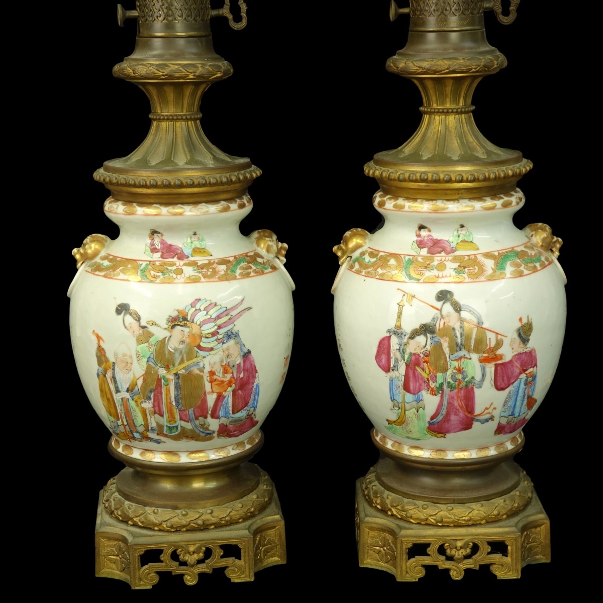 Pair of Late 19th Century Chinese Rose Mandarin Jars Bronze Mounted as Lamps. Figural scenes on front and obverse side, stamp marks and -calligraphy, and mock foo dog handles. Jars measures 8-1/2" H x 7-1/2" W, overall measures 25-1/2" H. Condition: Rubbing to enamel otherwise good condition Estimate: $300.00 - $500.00 Domestic Shipping: Third party