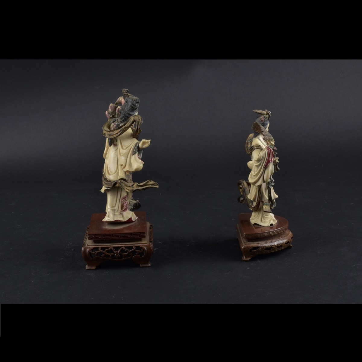 Two (2) Chinese Polychrome Carved Ivory Figurines Mounted on Wooden Base. Tallest carving measures 6" H x 5-1/2" W. We Will Not Ship This Item Out of State of Florida. Anyone Having This Item Shipped Must Have a Florida Address or the Item will not be Shipped. We will Not Knowingly Sell Endangered Species outside of Legal Channels. Condition: Some losses otherwise good condition Estimate: $300.00 - $500.00 Domestic Shipping: $76.00