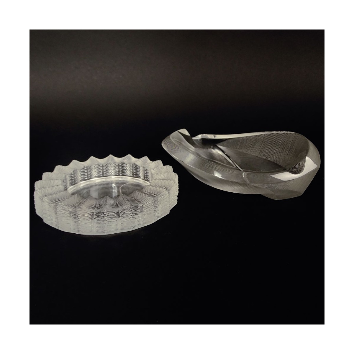 Two Lalique Crystal Bowls - Ashtrays. Jamaica Pattern, signed, minor scratches on bottom, 5-1/2". The other Philippines pattern, signed, small slice, 7-1/2". Condition: Philippines pattern, signed, small slice, Estimate: $50.00 - $150.00 Domestic Shipping: $65.00