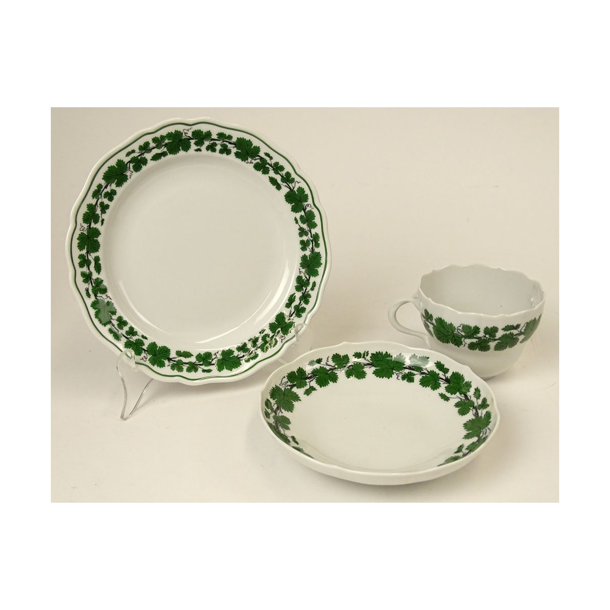 Three (3) Pieces Antique Meissen Green Vine, Cup, Fruit bowl and Cake Plate Set. Signed on Bottom with Blue Crossed Swords (cup and bowl with double slash). . Cake Plate Measures 7 Inches Diameter. Condition: Good Condition Estimate: $50.00 - $150.0 Domestic Shipping: $68.00
