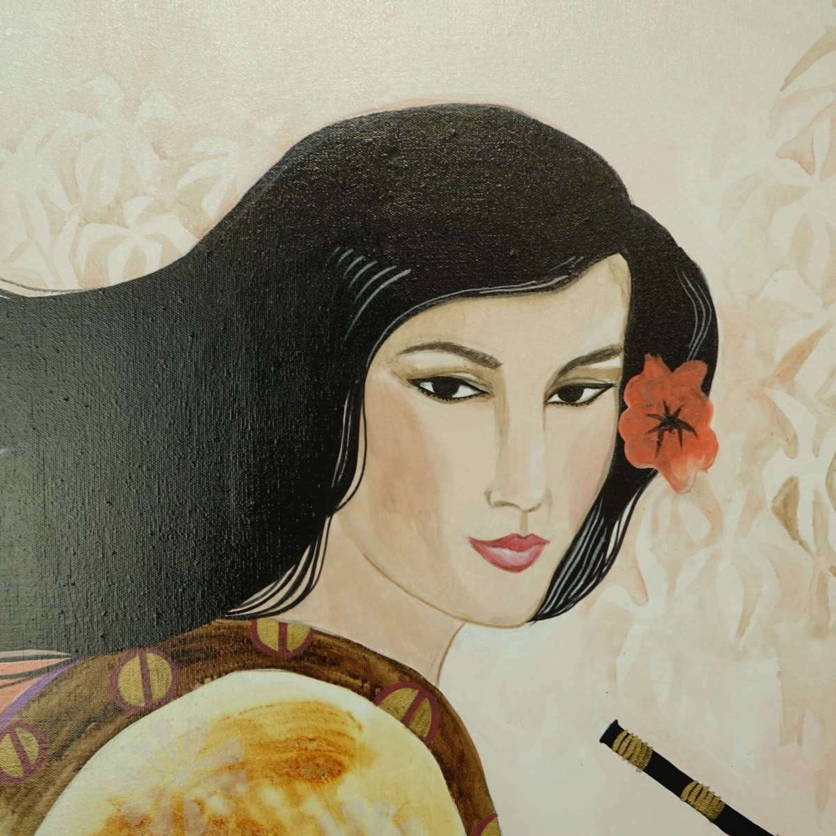 Large Contemporary Oil On Canvas "Asian Woman With Flute". Signed lower left Martinique, Asian Character Signature. Measures 60" x 48", frame measures 63" x 51". Condition: Good condition Estimate: $50.00 - $150.00 Domestic Shipping: Third Party