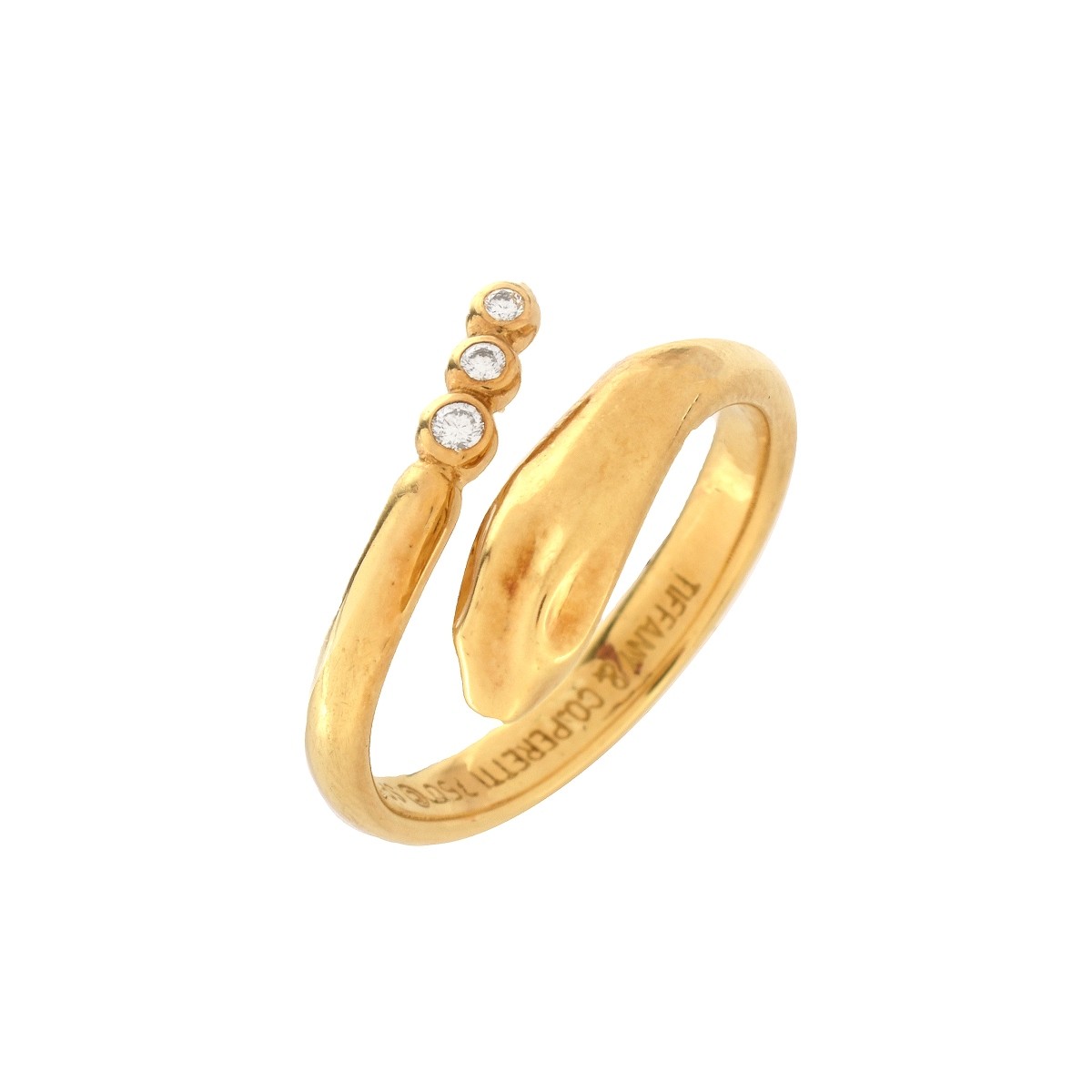 Elsa Paretti for Tiffany & Co Three Diamond and 18 Karat Yellow Gold Delicate Snake Ring. Signed, stamped 750, Spain. Ring size 6. With Tiffany box. Approx weight: 4.4 grams. Condition: Very good condition. Estimate: $300.00 - $500.00 Domestic Shipping: $28.00