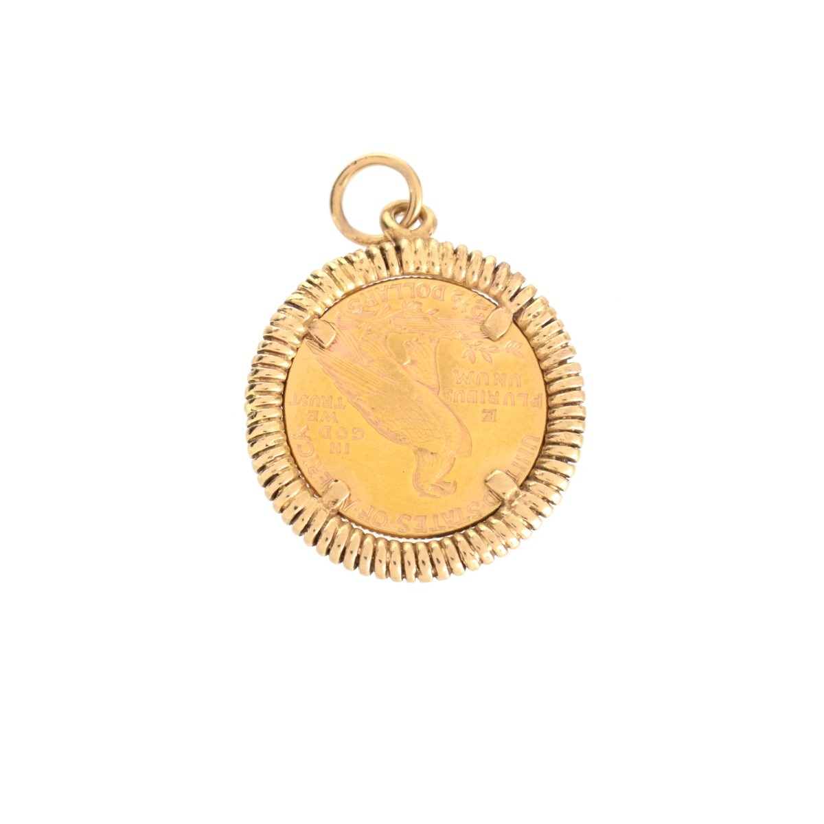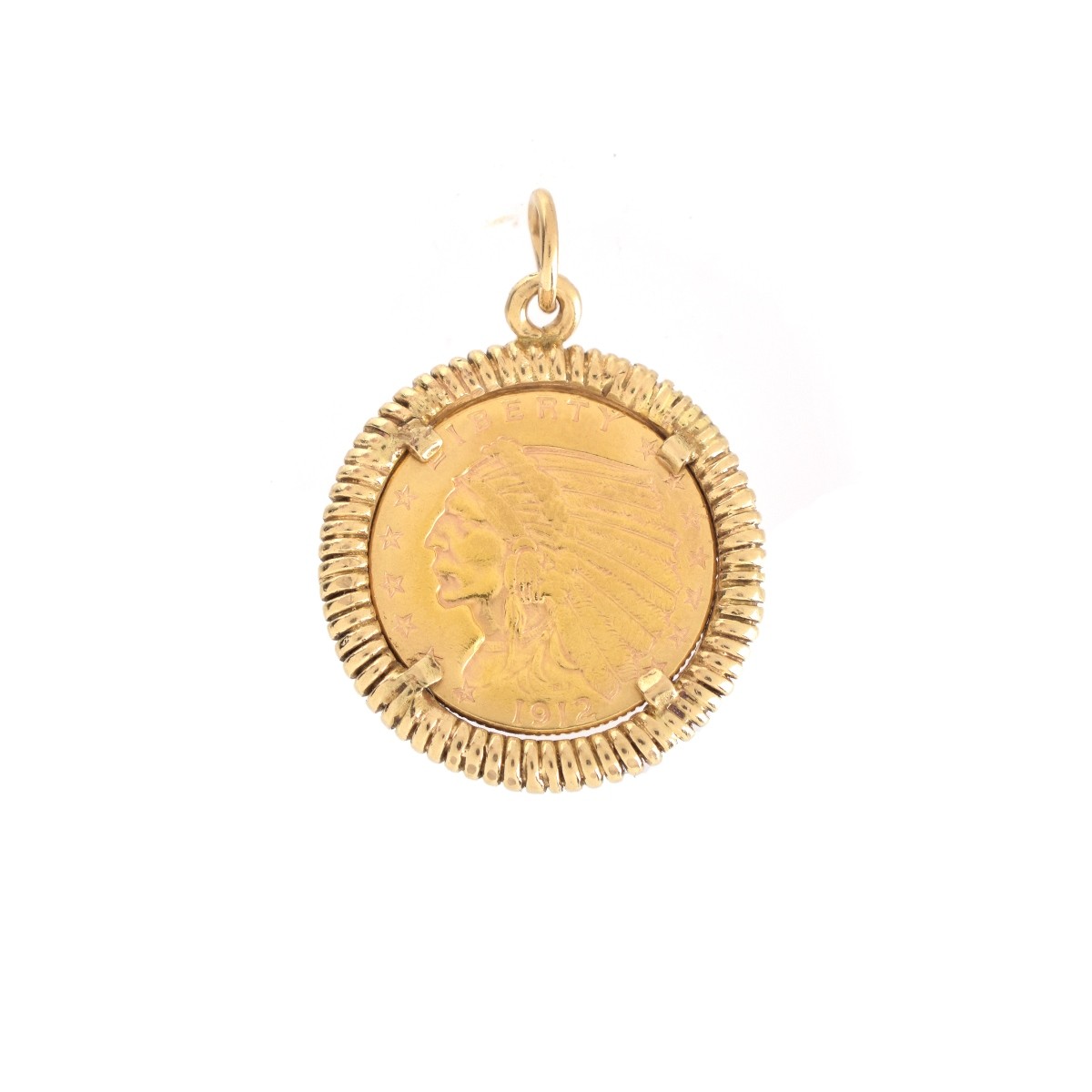 1912 US Gold Indian Head $2.50 Coin Mounted in 14 Karat Yellow Gold Bezel. Front: bust facing left. Obverse: standing eagle. Designed by: Bela Lyon Pratt. Coin size: 18mm. Overall measures 1" H x 7/8" W. Coin weight: 4.18 grams. Overall approx. weight: 8.4 grams. Condition: Good condition. We DO NOT Grade Coins, Please View Photos and/or Information to Make your Own Value Judgment as to the Condition of these Coins. Estimate: $600.00 - $800.00 Domestic Shipping: $32.00