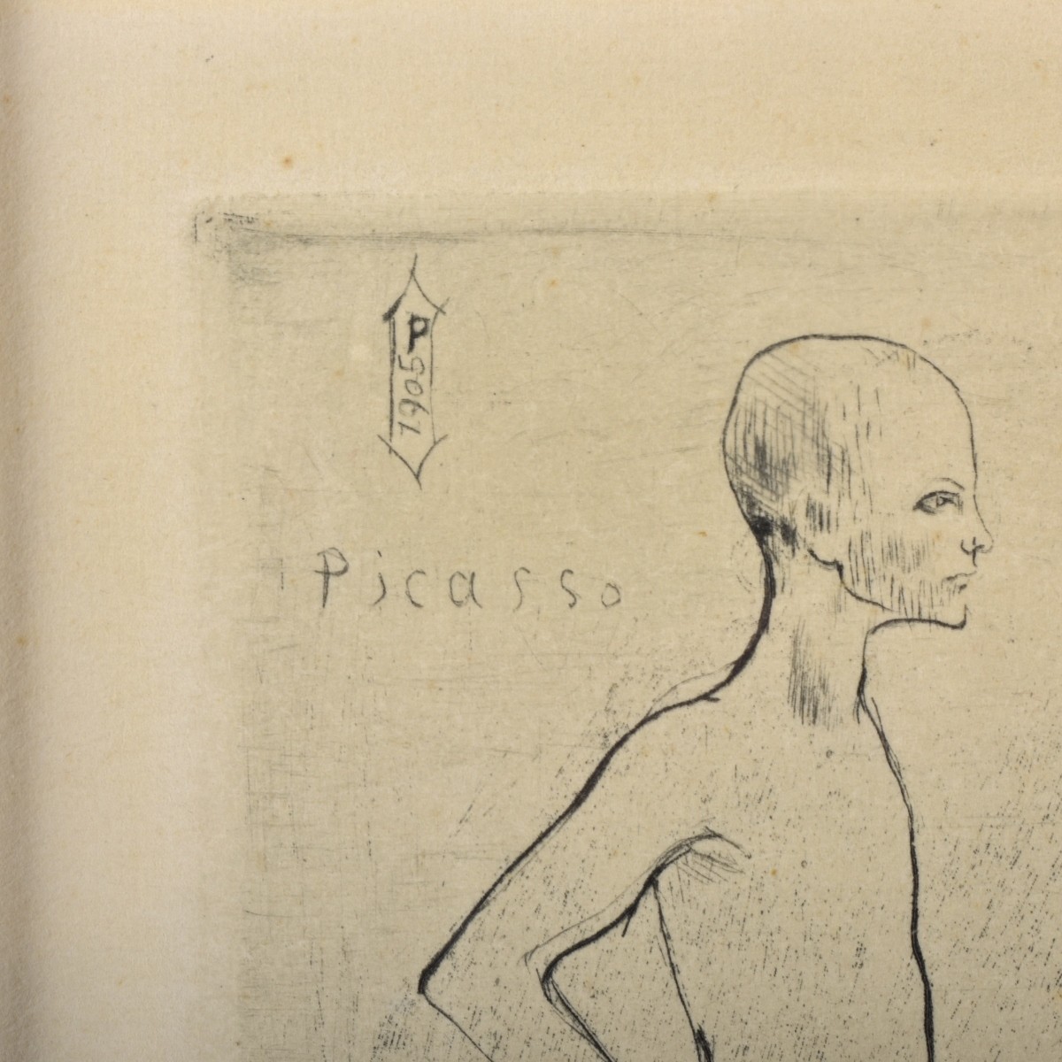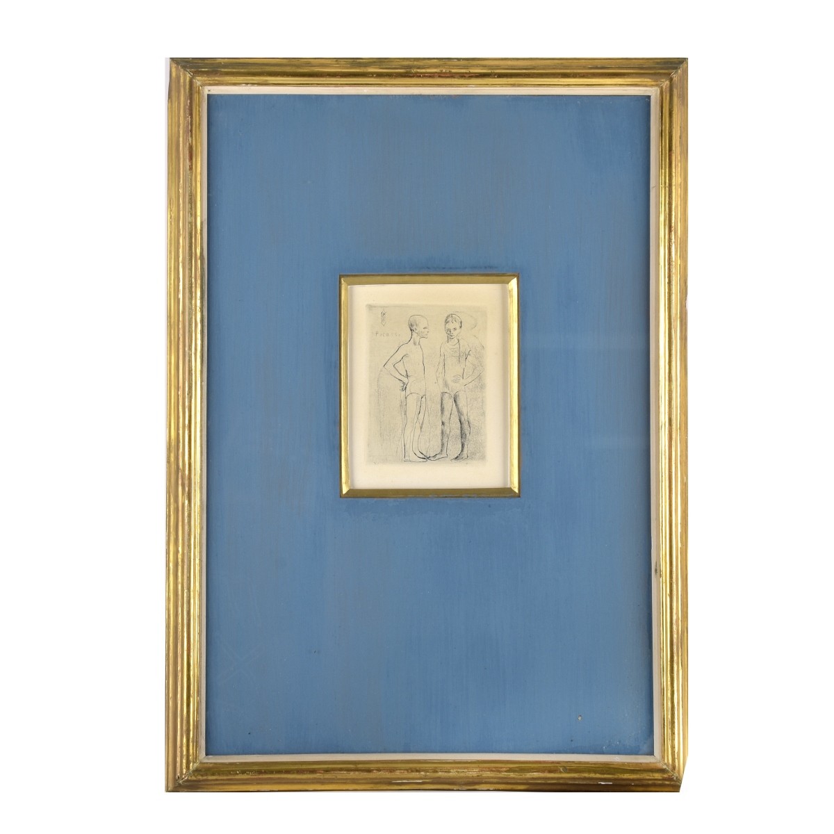 Pablo Picasso, Spanish (1881 - 1973) Drypoint Etching on Wove Paper "Les Deux Saltimbanques, 1905" Signed in the Plate. inscribed en verso. Sight measures 6" H x 4-3/4" W, frame measures 21-3/8" H x 15" W. Condition: Very light foxing overall good condition Estimate: $2000.00 - $4000.00 Domestic Shipping: $145.00