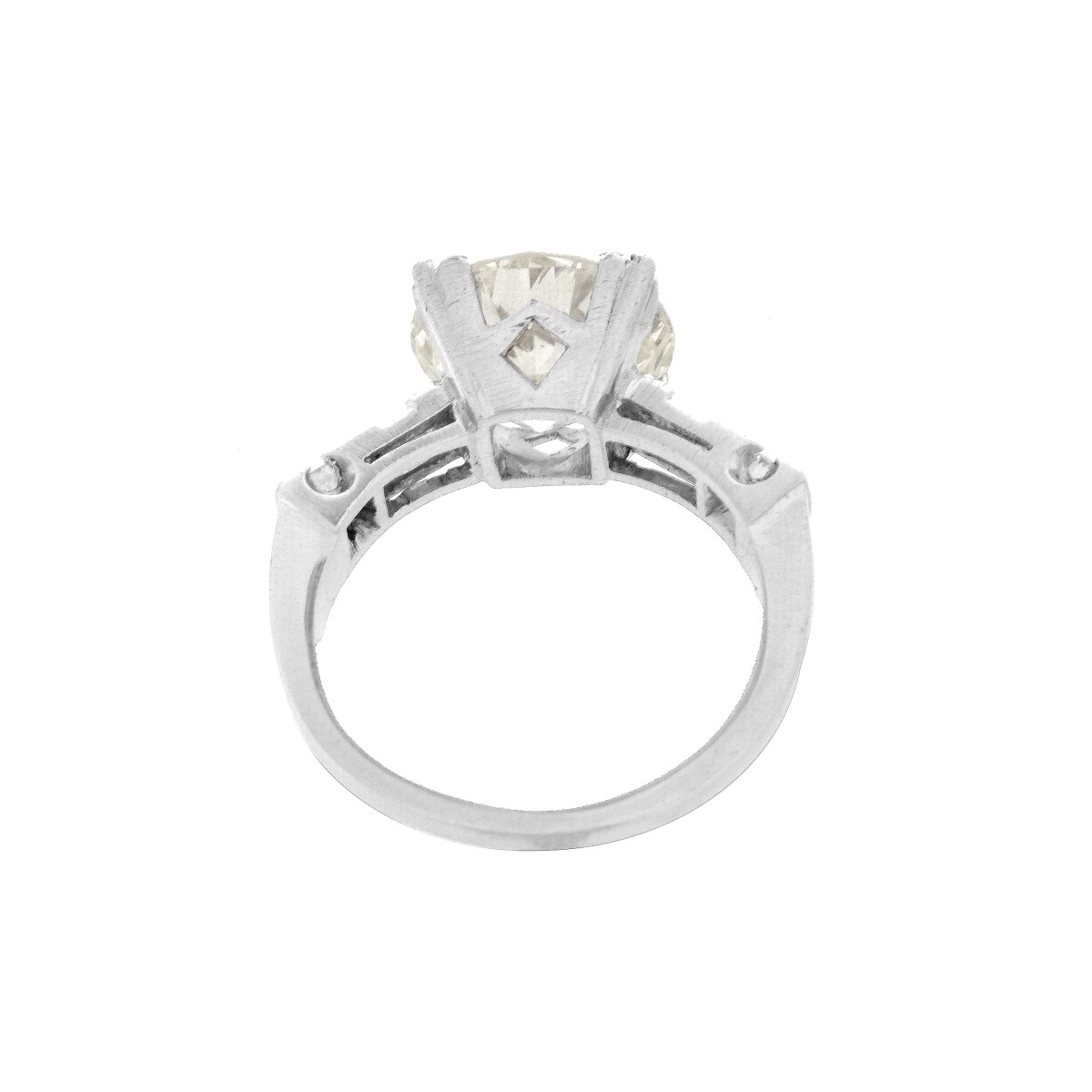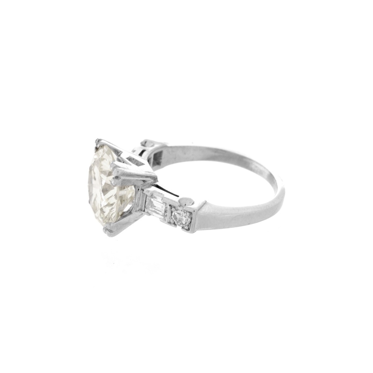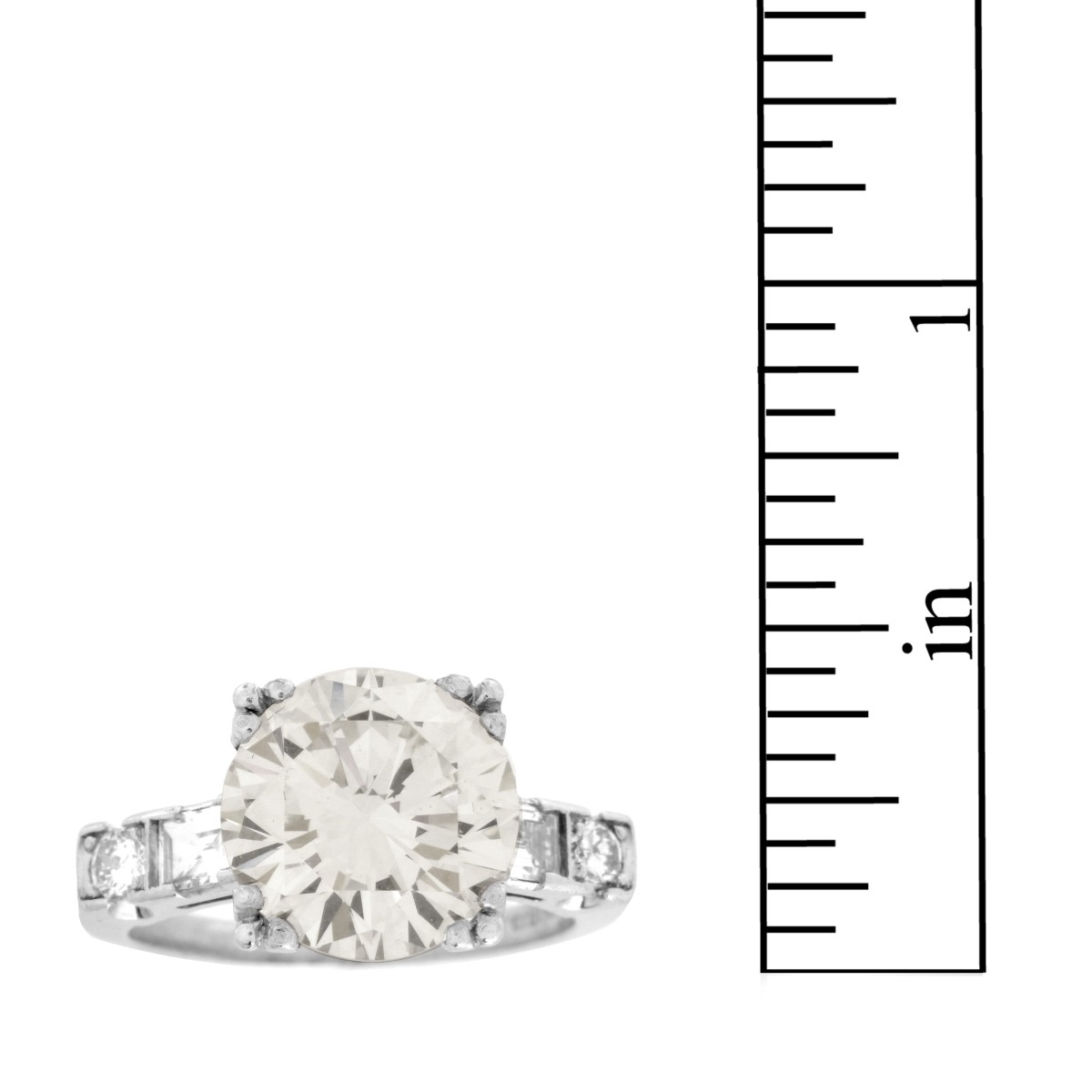 Approx. 4.38 Carat Round Brilliant Cut Diamond and Platinum Engagement Ring. Accented with four .60 carat TW round and baguette cut diamonds. Center diamond K color, VS clarity. Stamped Plat. Ring size 6-3/4. Approx. weight: 7.6 grams. Condition: Very good condition. Estimate: $20000.00 - $30000.00 Domestic Shipping: $28.00