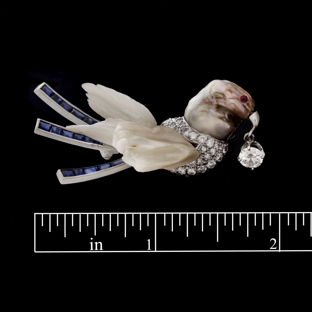 GIA Certified Four Natural Freshwater Baroque Pearl, Round Brilliant Cut Diamond, Baguette Cut Sapphire, Ruby and 18 Karat White Gold Bird Brooch. Pearls are variously colored. Measures 1" H, 1-7/8" W. Approx. weight: 12.0 grams. GIA Report 1206798694 dated 1/3/2020 to accompany this Lot. Condition: Very good vintage condition. Estimate: $5000.00 - $7000.00 Domestic Shipping: $32.00